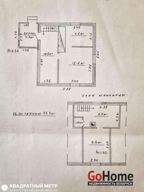 Дом щитовой, обложенный кирпичом, двухэтажный, площадь – 75,3 м2. На первом этаже две комнаты и кухня, на втором этаже одна комната.