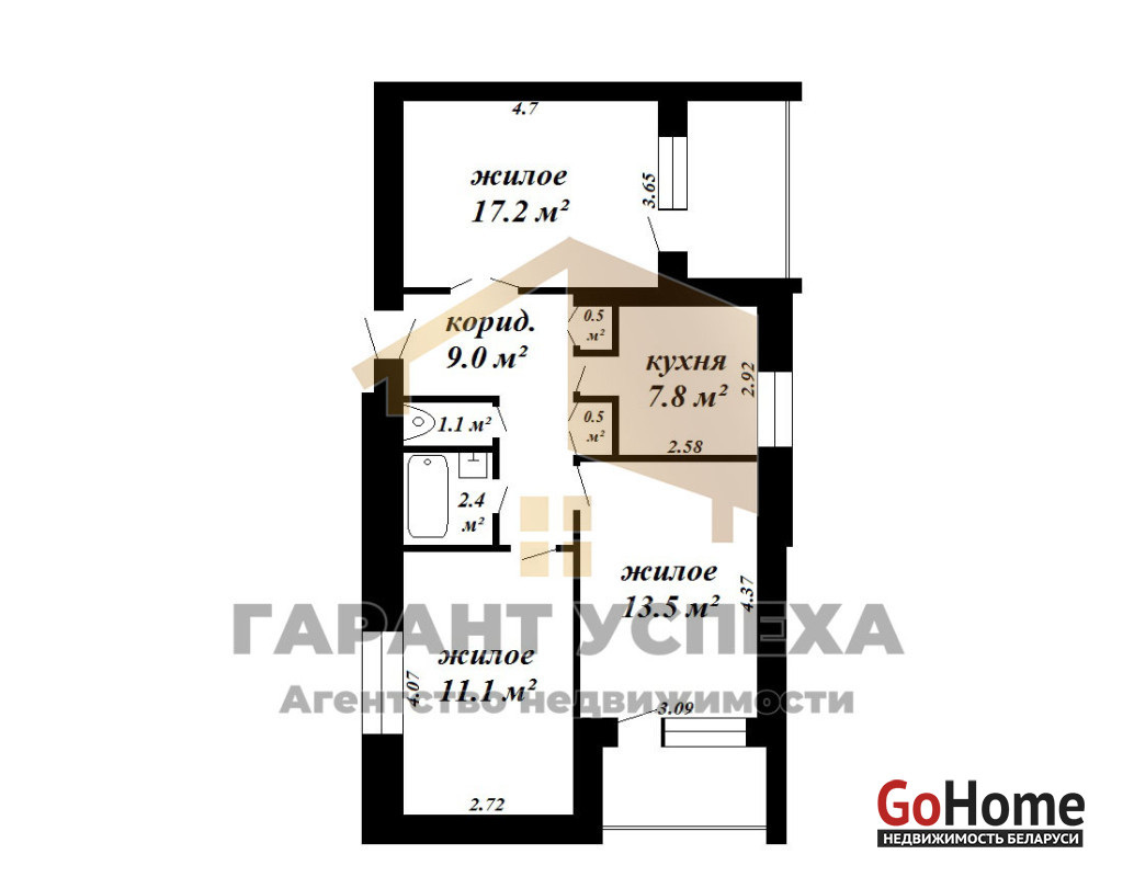 Удобная планировка: три жилые комнаты (17,2 м², 13,5 м² и 11,1 м²), раздельный санузел. В квартире имеется застекленная лоджия с выходом из зала, просторный коридор 9,0 м².