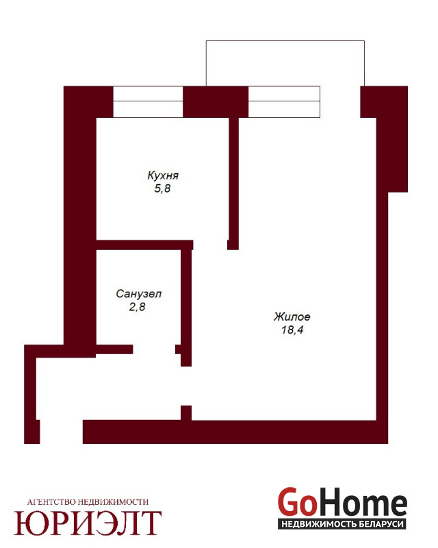 Общая площадь - 31 кв.м., жилая - 18,4 кв.м., кухня - 5,8 кв.м.