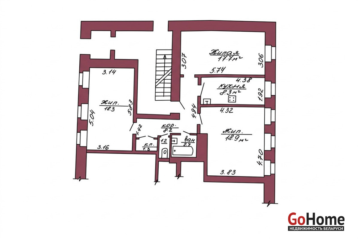 В продаже просторная 3-комнатная квартира в историческом центре Гродно - по ул. Кирова, 9. Дом 1880 года постройки. Материал стен -кирпич, перекрытия ж/б панели, полы ДВП, линолеум, в санузле плитка, окна деревянные. Площадь квартиры 76,6 м2, жилая площадь 54,9 м2, кухня 8,3 м2. Квартира расположена на высоком 1-ом этаже двухэтажного дома, за квартирой закреплена подвальная ячейка.
