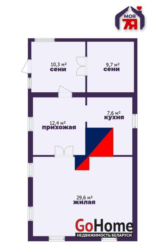 - Планировка дома состоит из одной жилой комнаты открытого пространства – 29,6 м2, двое сеней 10,9 м2 и 9,7 м2, прихожей 12,4 м2 и кухни 7,6 м2, где принимать гостей будет одно удовольствие.