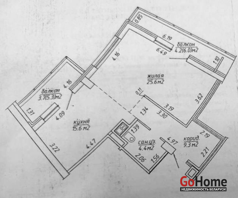- площадь: общая — 54,9 м², жилая — 25,6 м², кухня — 15,6 м²;