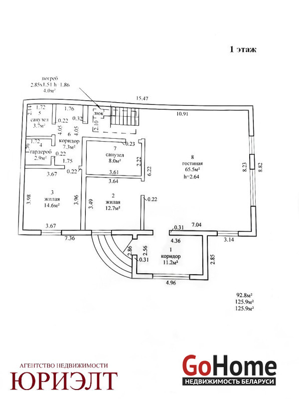 Дом введен в эксплуатацию в 2025 г. Общая площадь жилых помещений - 254,1 кв.м. На 1-м этаже предусмотрены: кухня-гостиная (65,5 кв.м.), две жилые комнаты (14, 6 кв.м. и 12,7 кв.м.), санузел (8 кв.м.), прихожая (11,2 кв.м.), коридор (7,3 кв.м.), гардероб (2,9 кв.м.), санузел/тех.помещение (3,7 кв.м.). Высота потолков - 2,64 м.