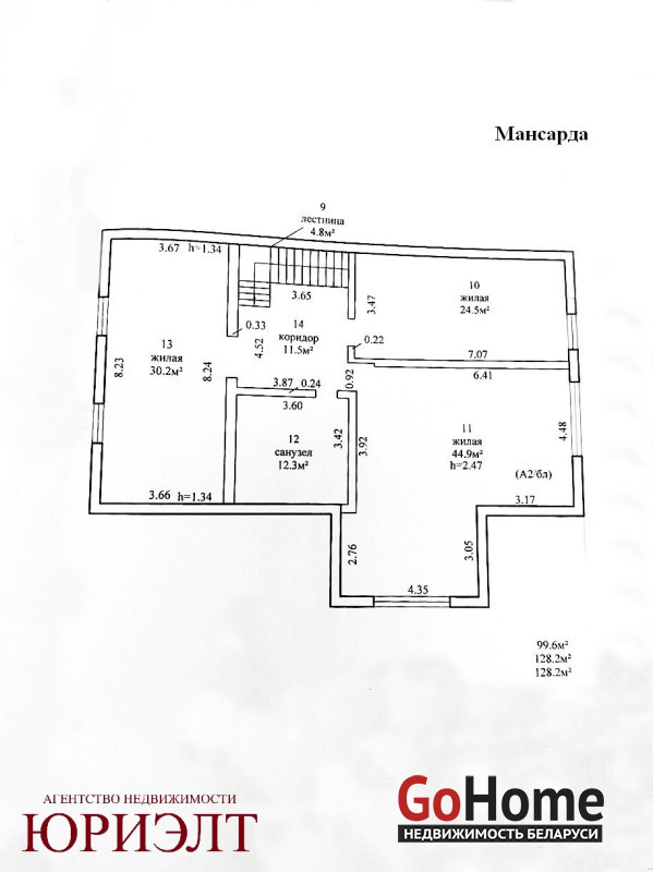 Лестница ведёт на 2-й этаж с 3 просторными жилыми комнатами (30,2 кв.м, 24,5 кв.м., 44,9 кв.м. ),с санузлом (12,3 кв.м), коридором (11,5 кв.м.). Высота потолка - 2,47 м.