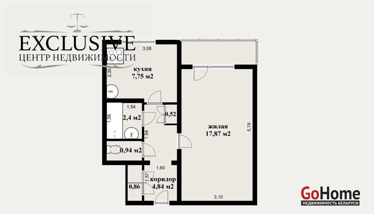 Площадь квартиры по СНБ - 37.8 кв.м., жилая-17.87 кв.м., просторная кухня 7.75 кв.м.