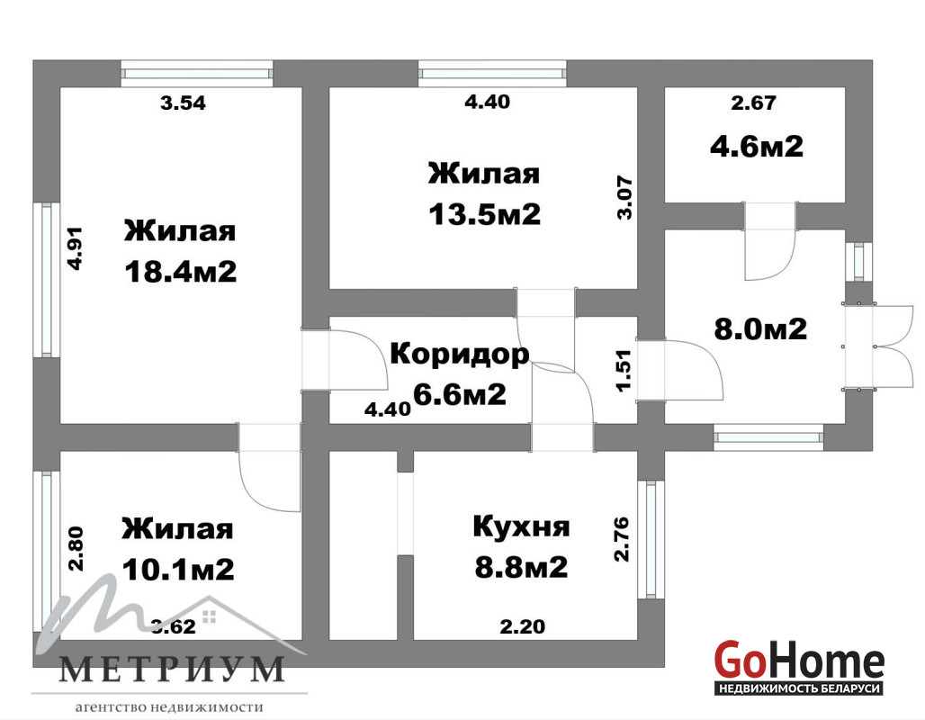В квартире 3 жилые комнаты 17,4 кв.м., 13,5 кв.м. и 10,1 кв.м., кухня с топочной 10,9 кв.м. и сан.узел 4,6 кв.м. Есть электричество и газовое отопление, канализация.