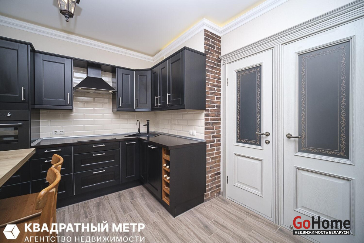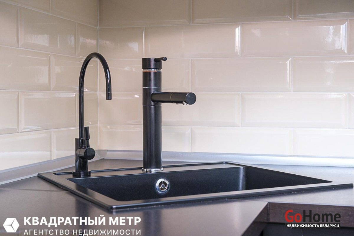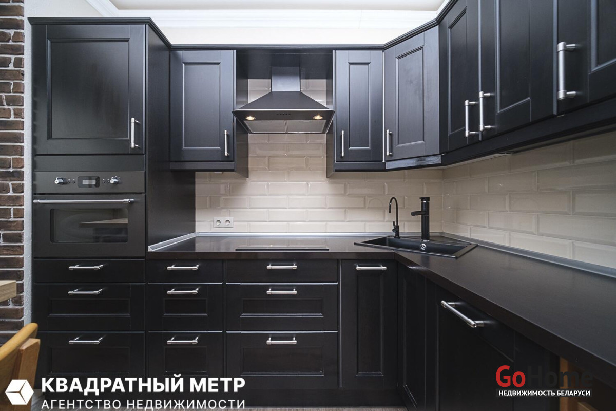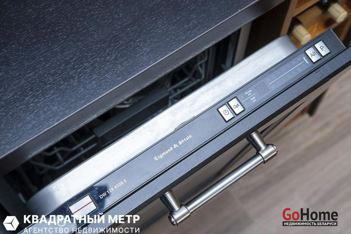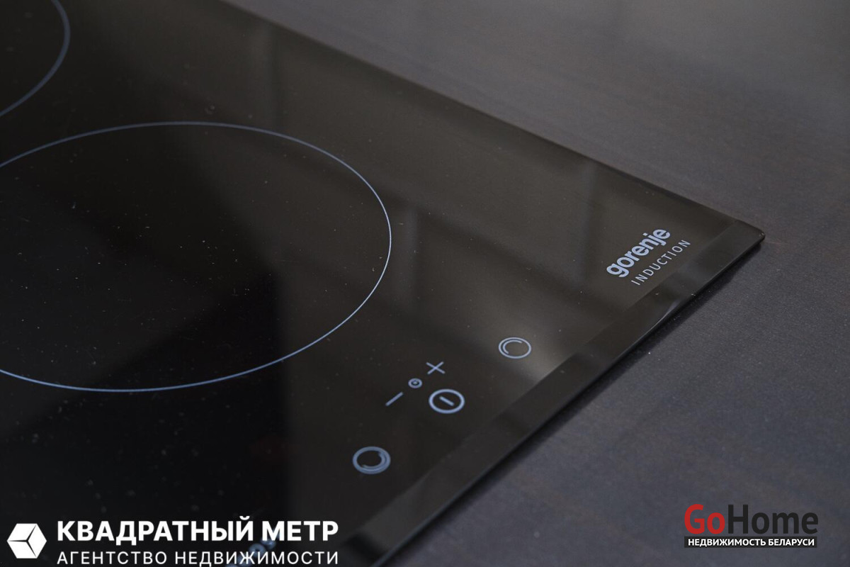 Кухня оборудована всей необходимой техникой: индукционная варочная поверхность, духовой шкаф с функцией СВЧ, вытяжка, встроенный холодильник, посудомоечная машина, раковина со смесителем, система очистки воды.