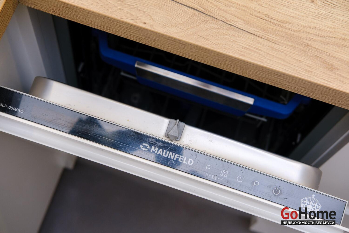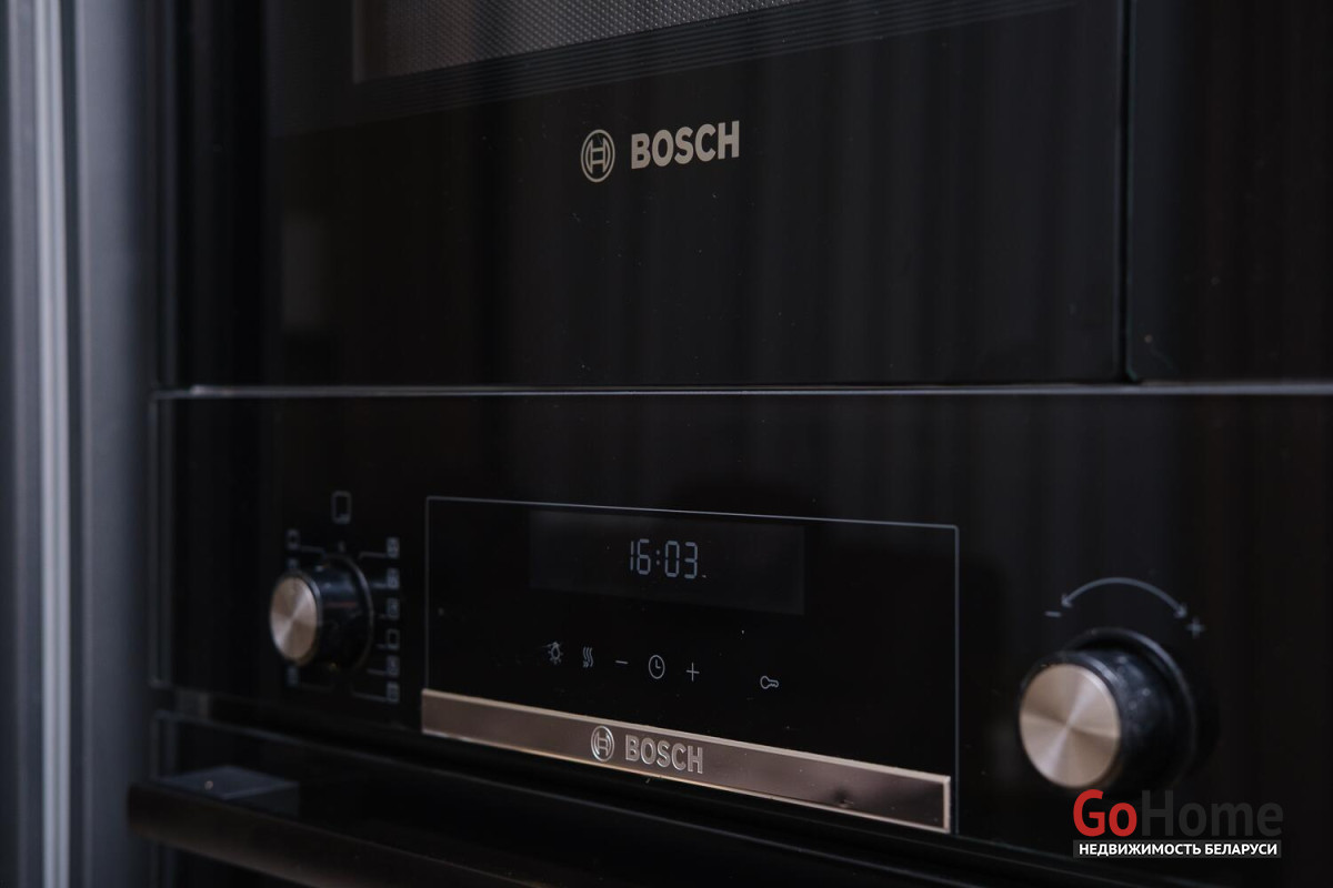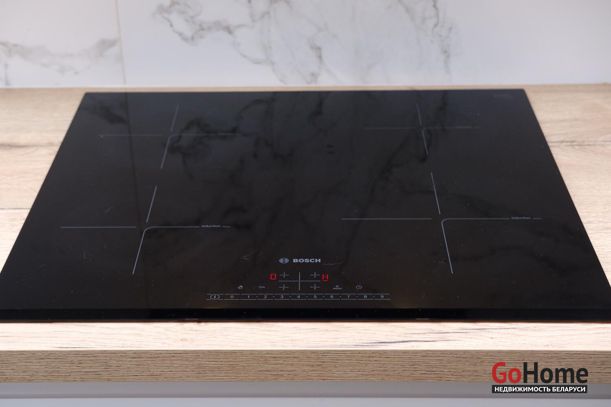 Кухня: большая, светлая. Встроенный гарнитур с практичными ламинированными фасадами полностью оснащен фурнитурой Blum, грамотно продуманы рабочие и обеденная зоны, скинали – итальянский керамогранит. Холодильник, варочная панель, духовой шкаф, микроволновка - Bosch, посудомоечная машина – Maunfeld. Кухня переходит в просторную гостиную с огромным удобным дорогим диваном и телевизором для уютных семейных вечеров. Вся техника и мебель остается будущим владельцам.