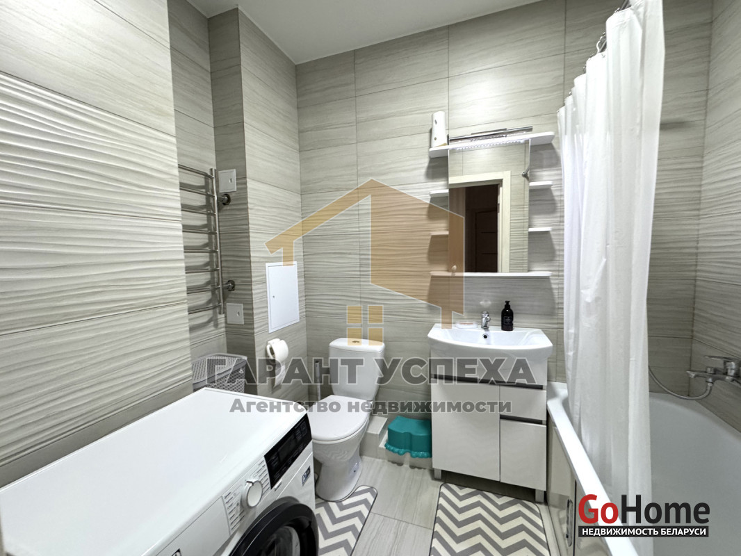 Современная отделка: На полу — качественный ламинат, стены оклеены обоями, потолок - натяжной. Раздельный санузел, облицованный плиткой.
