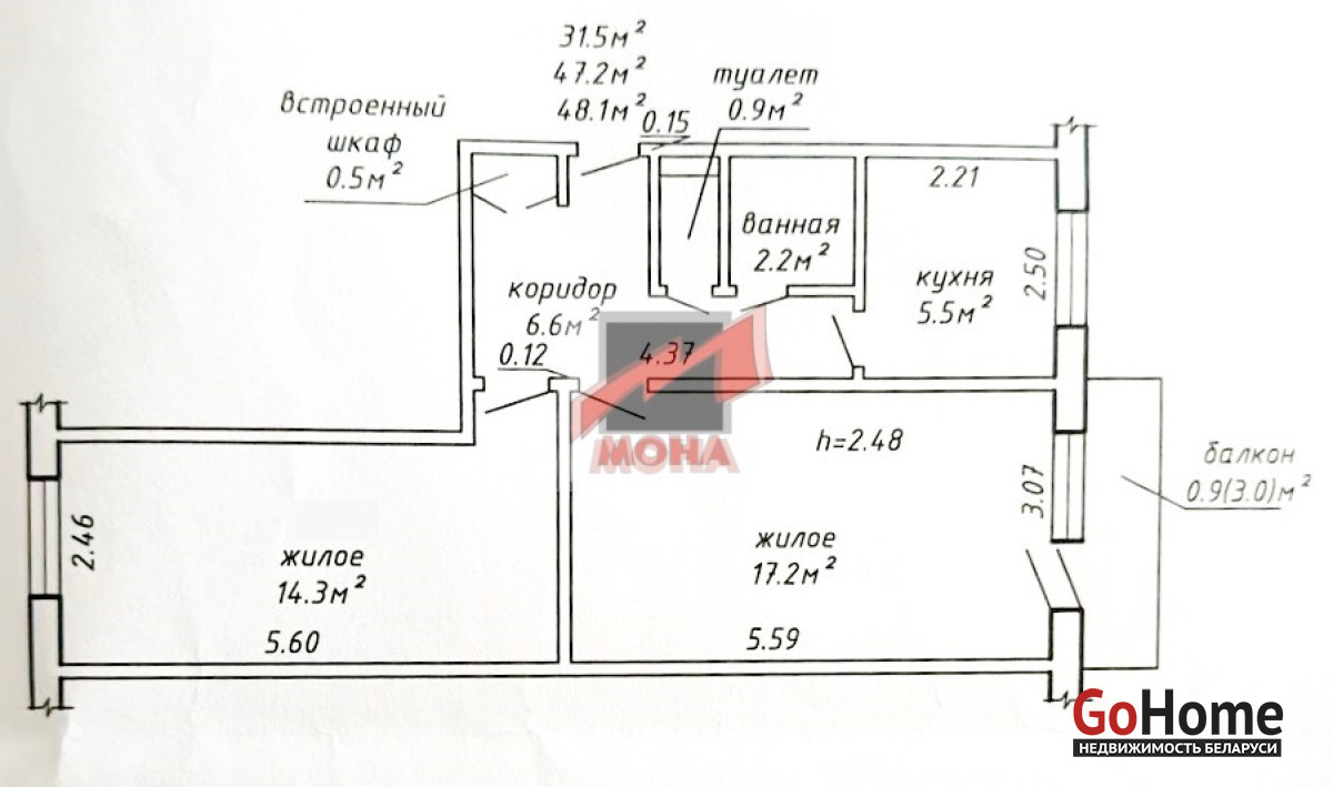 Площади: СНБ: 48,1 м2, общая: 47,2 м2, кухня: 5,5 м2. Комнаты: 17.,2+14,3 м2.С/у раздельный, балкон застеклён ПВХ из комнаты и деревянные снаружи.