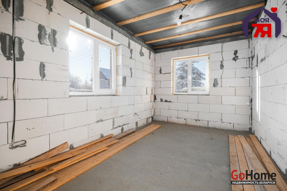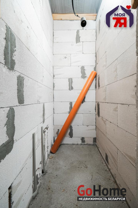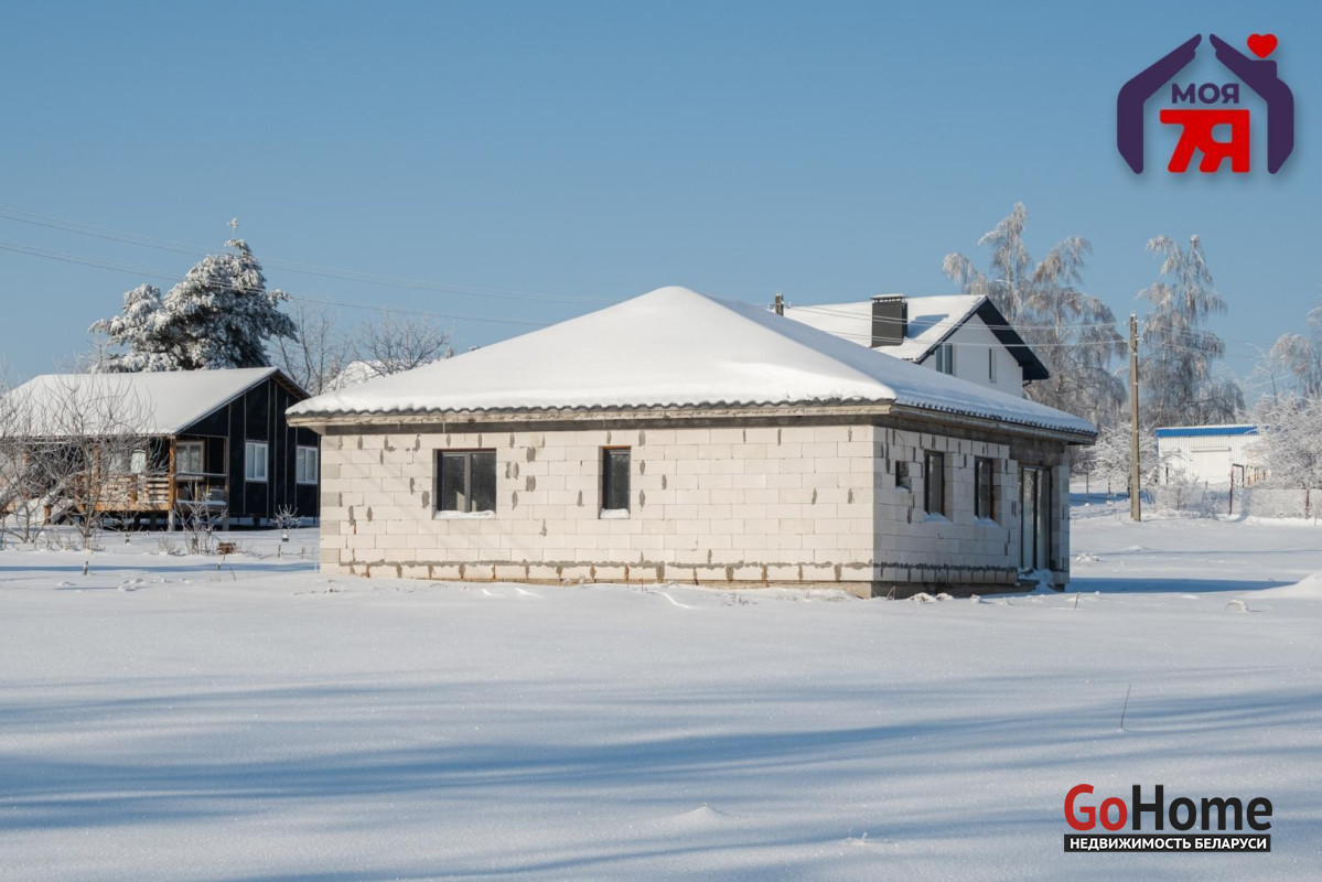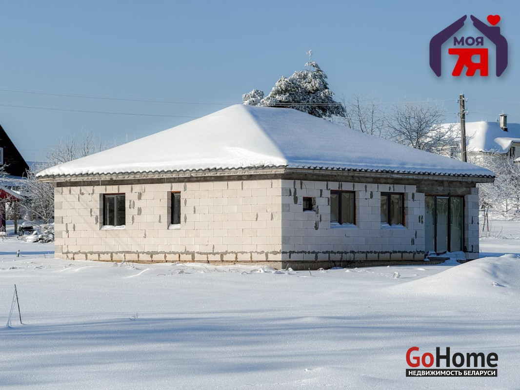- Блочный дом, одноэтажный, площадью 100 м2. Коммуникации полностью подведены. Установлены окна и двери. Крыша — металлочерепица, утеплена. Смонтирован теплый пол.