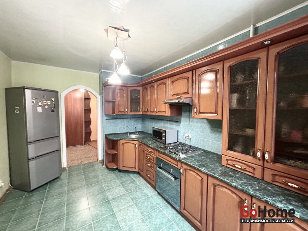 Просторная кухня оборудована варочной панелью, духовым шкафом и холодильником. Продажа с техникой и мебелью.