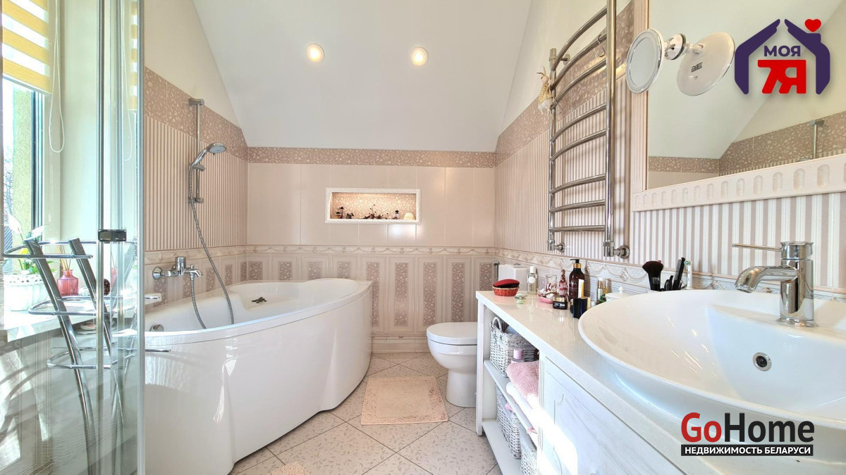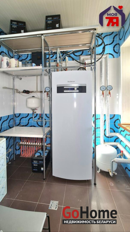 - Инженерия — ключевое преимущество объекта. Отопление на базе геотермального теплового насоса, в связке с котлом Buderus Logatherm (13,5 кВт), работающим в комбинированном режиме. Тепло извлекается через две скважины по 95 метров. Дом энергонезависим от газа. Подведено трёхфазное электричество, подключён льготный тариф (4,5 коп./кВт·ч). Потребление зимой — до 1000 кВт·ч(45 рублей), что в разы эффективнее и дешевле любого другого типа обогрева. Также система рассчитана к подключению солнечных панелей.