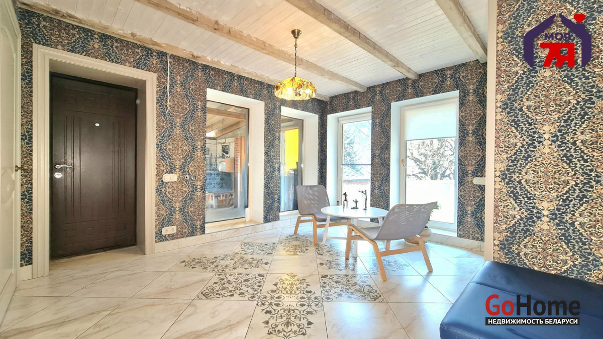 - Дом 2018 года постройки возведён по капитальной технологии. Несущие стены из газосиликата толщиной 50 см обеспечивают высокую теплоаккумуляцию. Дополнительно контур утеплён пеноплексом 5 см и защищён штукатуркой «короед». Такие стены гарантируют отсутствие мостиков холода и конденсата.