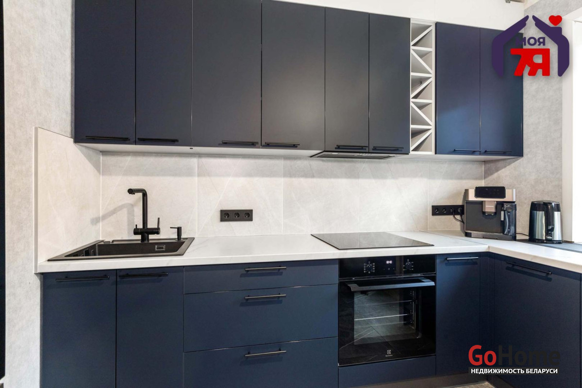 - Кухня 8,8 м2 — действительно просторная, здесь есть новая встроенная кухня, место и для рабочей зоны, и для стола, где можно спокойно завтракать. На полу уложена практичная плитка. Кухонные фасады и тумбочка для кухни PerfectSense Premium Matt. Установлен фильтр для питьевой воды Барьер.