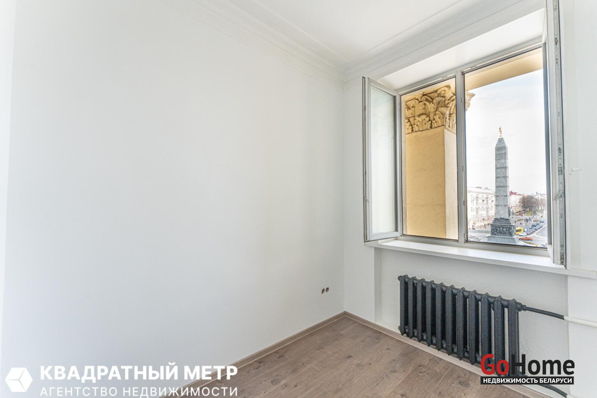 Из окон квартиры открывается прямой вид на площадь Победы и проспект Независимости — одну из самых красивых и знаковых локаций Минска.