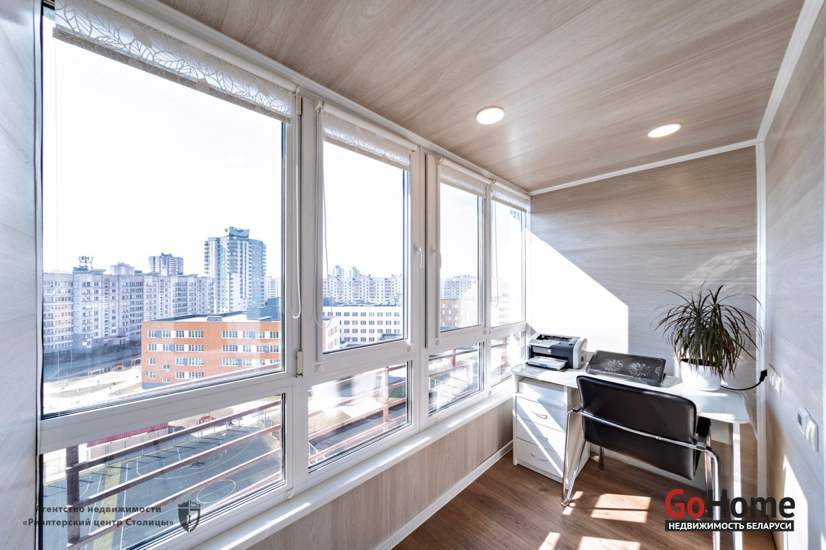 Лоджия 4.3м2 с хорошим ремонтом, утеплена и застеклена двойными стеклопакетами ПВХ. Используется как кабинет.А выход на неё осуществляются из кухни. На полу ламинат.
