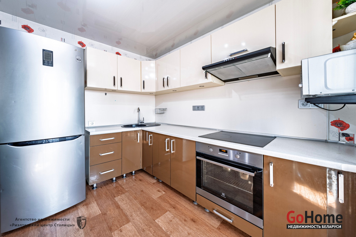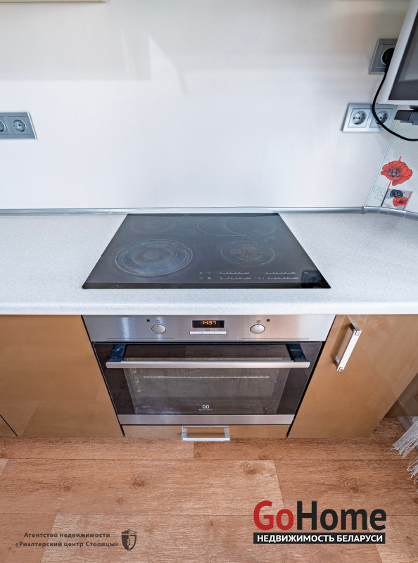 Встроенная техника: варочная поверхность, духовой шкаф, холодильник, печь СВЧ.