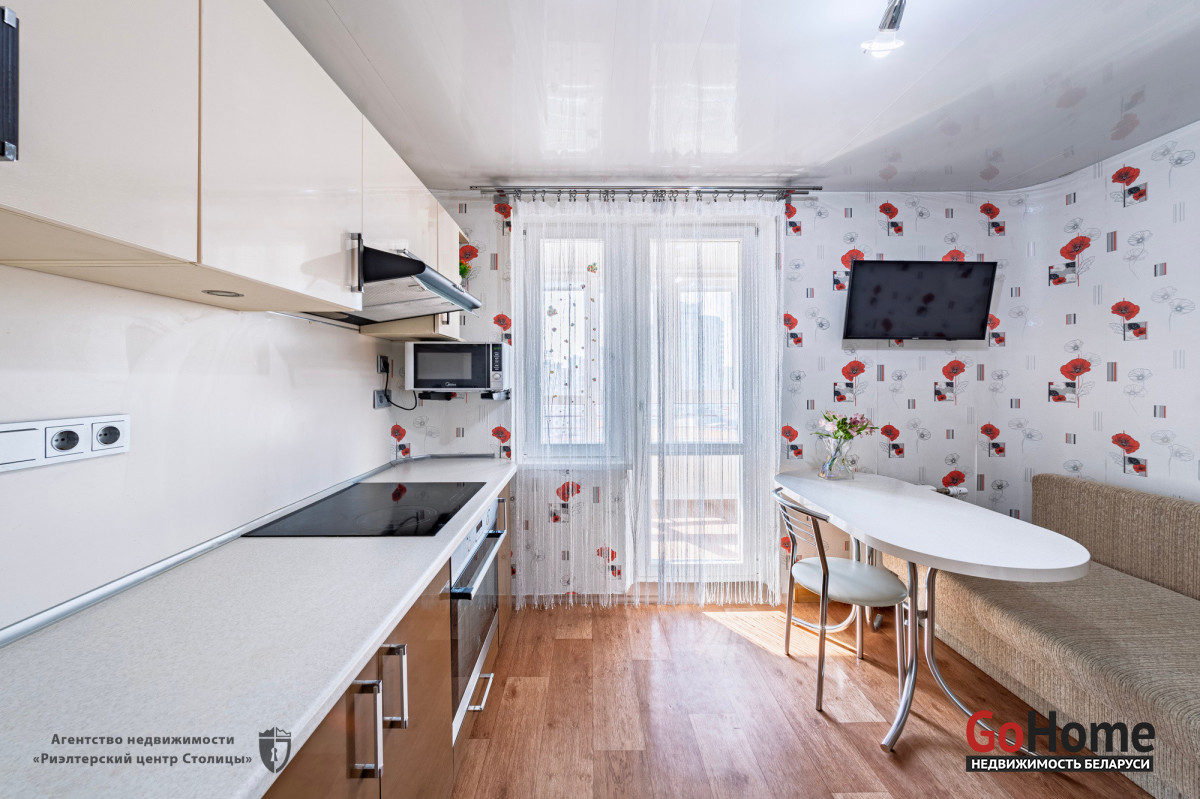 Кухне 9.0м2, на которой установлены встроенная кухонные шкафы с комфортной обеденной зоной и диванчиком. Шкафчики все на доводчиках.
