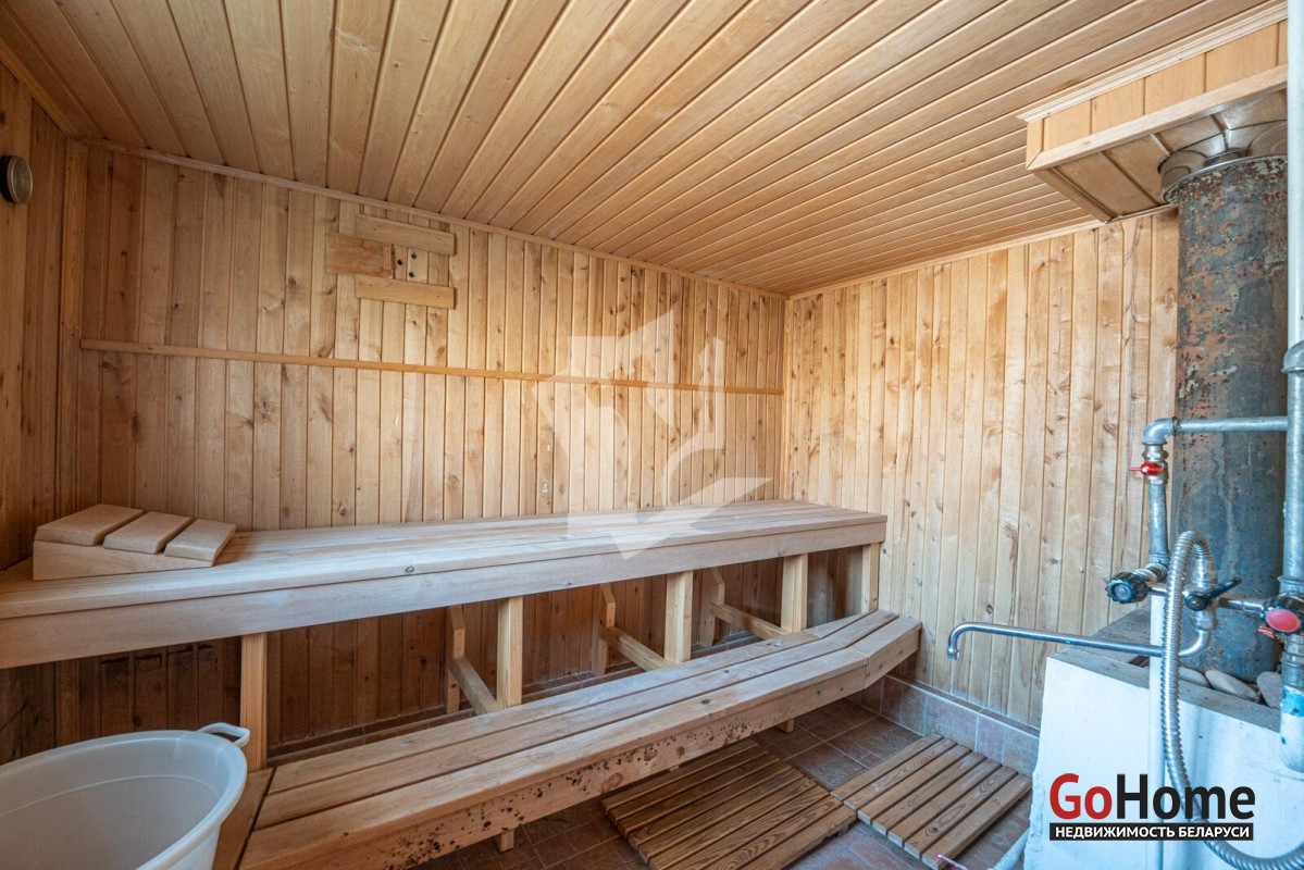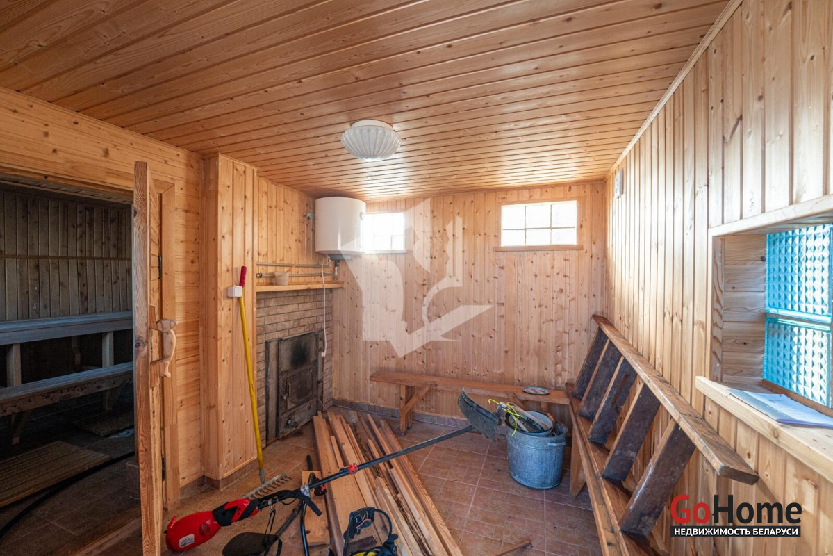 Отдельно стоящая кирпичная, обшитая изнутри деревом, баня с настоящими полками из лиственницы и предбанником из ольхи. Дровяная топка и электрический бойлер на 50 литров.