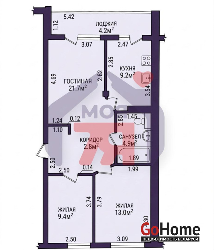 - Три раздельные комнаты позволяют каждому члену семьи иметь личное пространство: просторная гостиная 21.7 м2, две жилые комнаты площадью 13.0 м2 и 9.4 м2 — идеальное решение для семьи с детьми или тех, кто ценит комфорт и уединение.