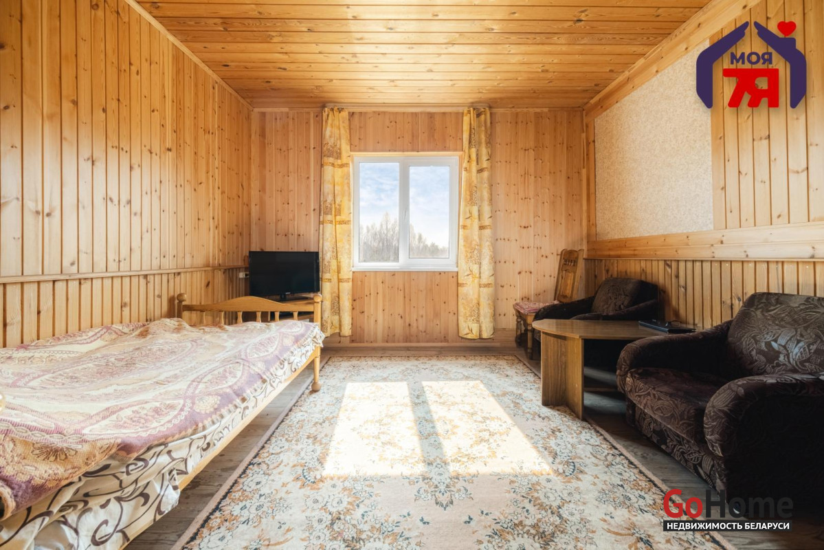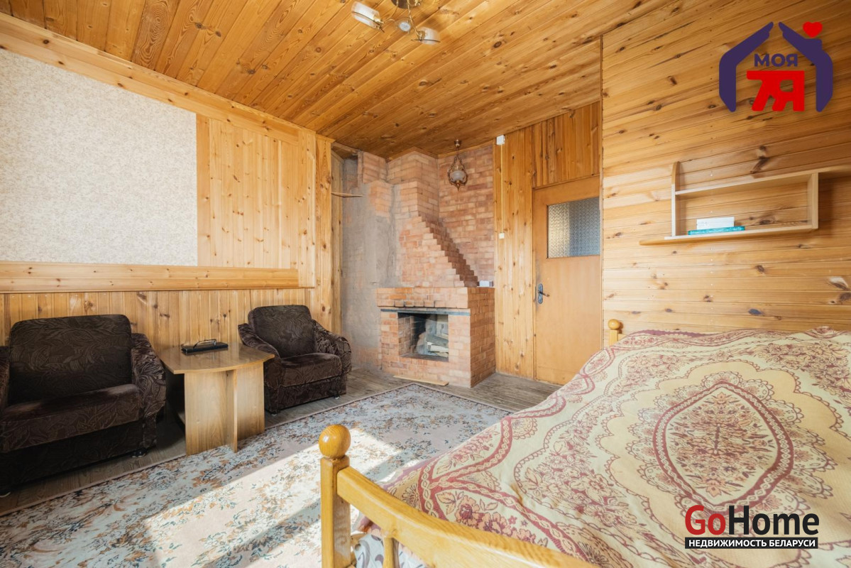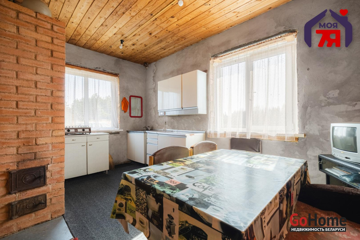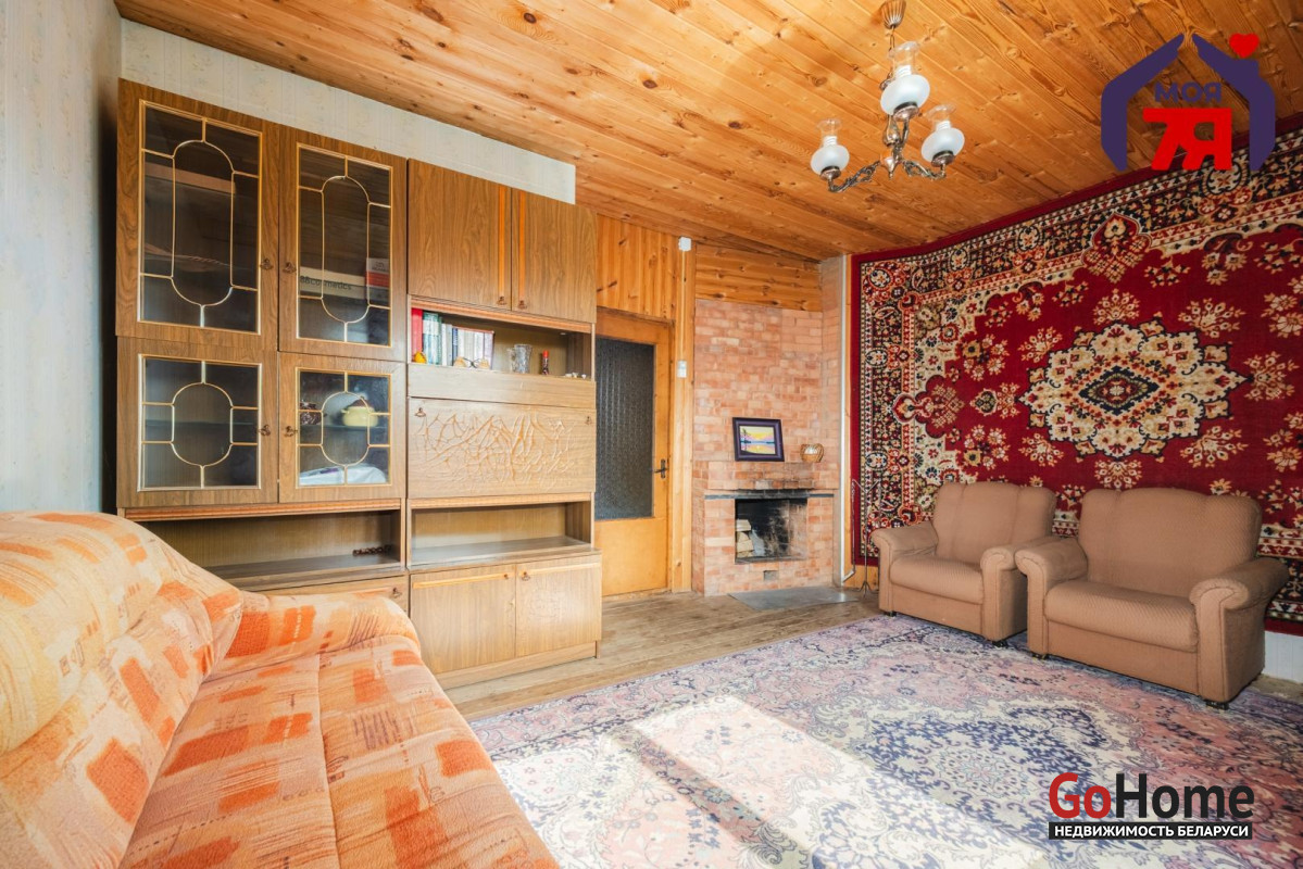 - В жилых комнатах отделка отличается: одна из комнат оформлена в классическом стиле с мягкой мебелью, большой стенкой и кирпичным камином, другие комнаты обшиты деревом, что создаёт особенно тёплую и уютную атмосферу. Кухня просторная, светлая, с двумя окнами, местом для большого обеденного стола, мойкой и печью, которая поддерживает указанное в карточке печное отопление.