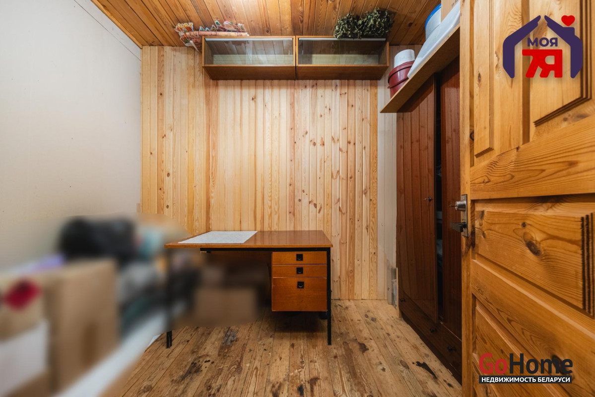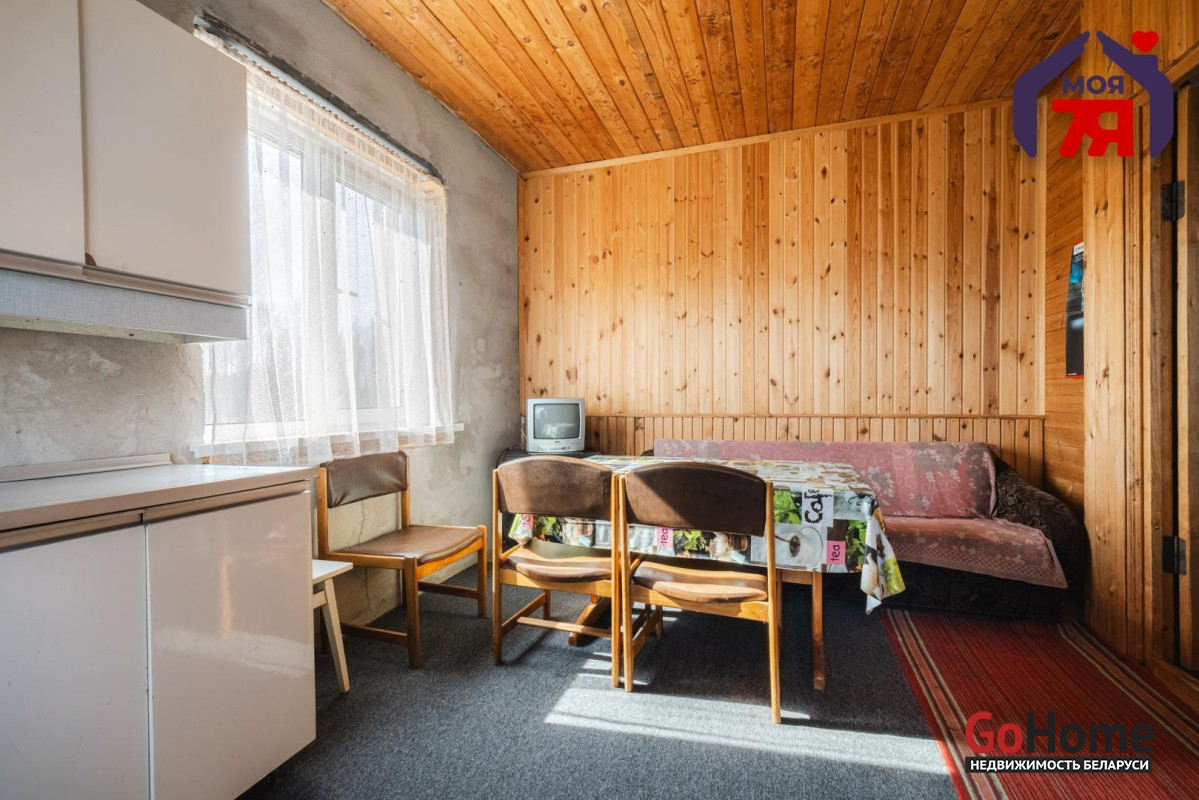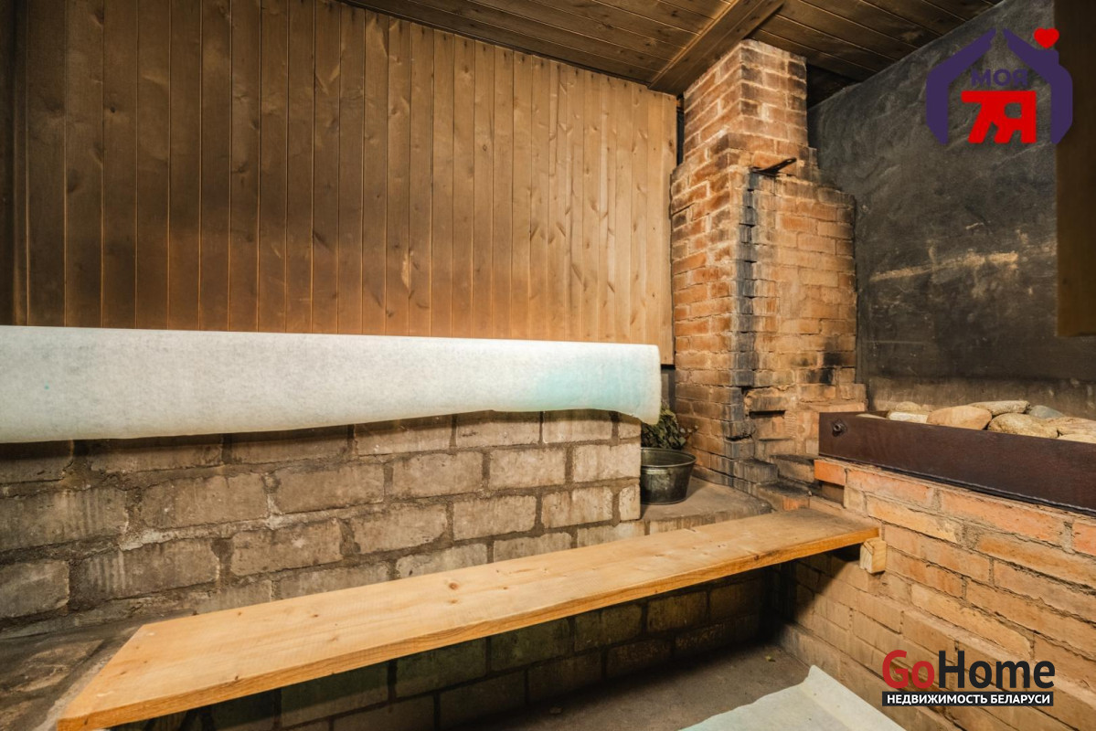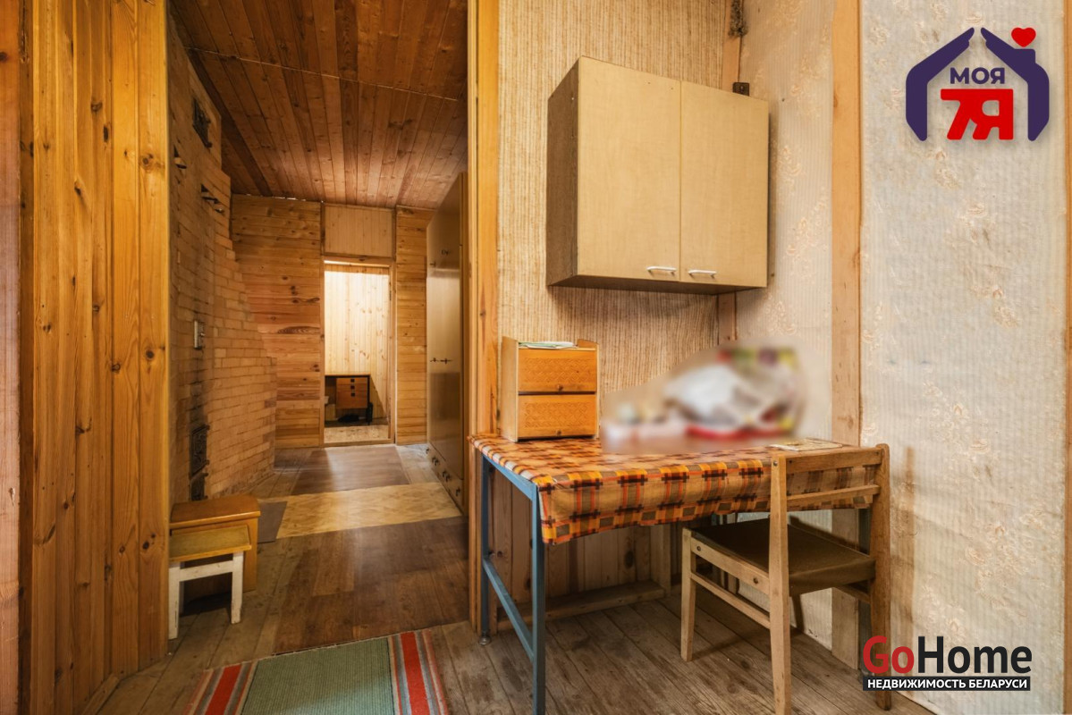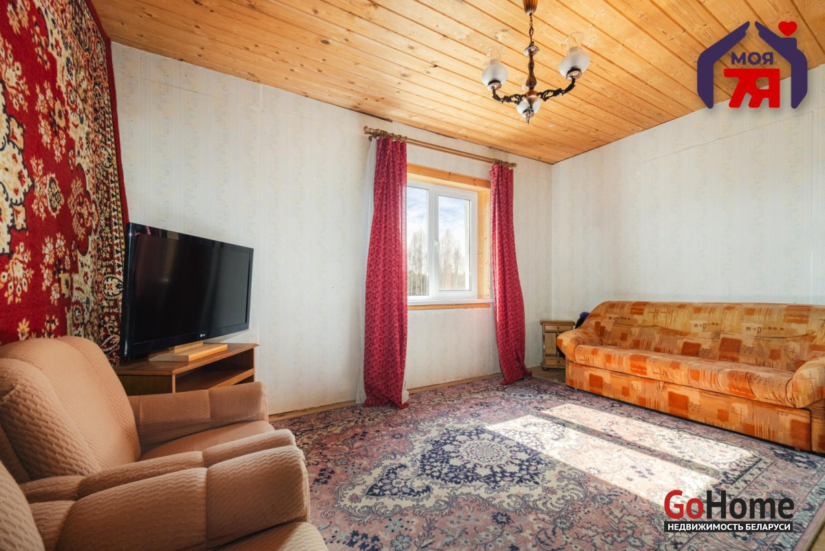 - В жилых комнатах отделка отличается: одна из комнат оформлена в классическом стиле с мягкой мебелью, большой стенкой и кирпичным камином, другие комнаты обшиты деревом, что создаёт особенно тёплую и уютную атмосферу. Кухня просторная, светлая, с двумя окнами, местом для большого обеденного стола, мойкой и печью, которая поддерживает указанное в карточке печное отопление.