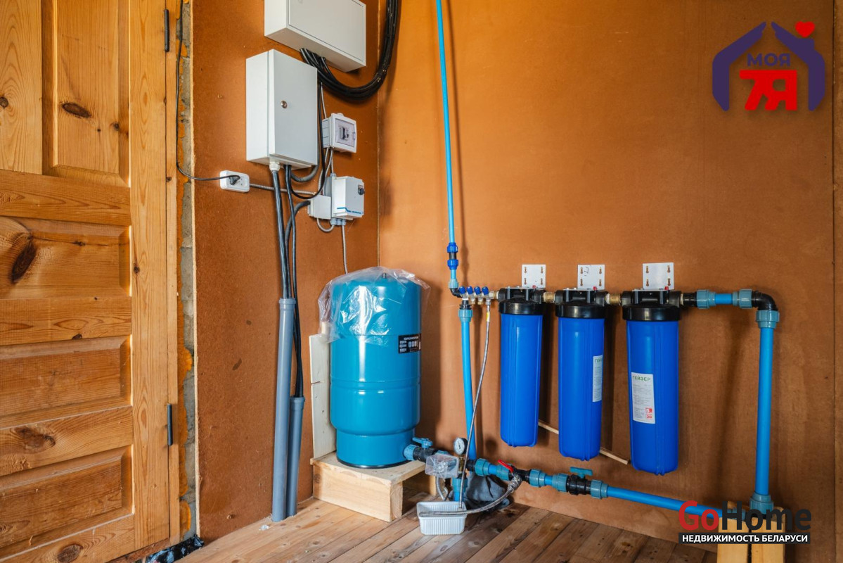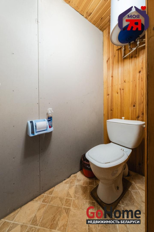 - Санузел организован отдельно, установлен бойлер, что обеспечивает наличие горячей воды. Также есть умывальная зона и баня, что является большим плюсом для загородного дома. В дом заведено электричество, водоснабжение — от скважины, канализация местная.