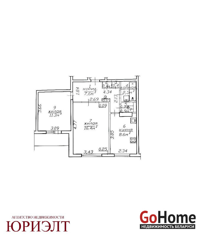 Общая площадь 51.3 м. кв., жилая 48.3 м. кв., кухня 8.6 м. кв.