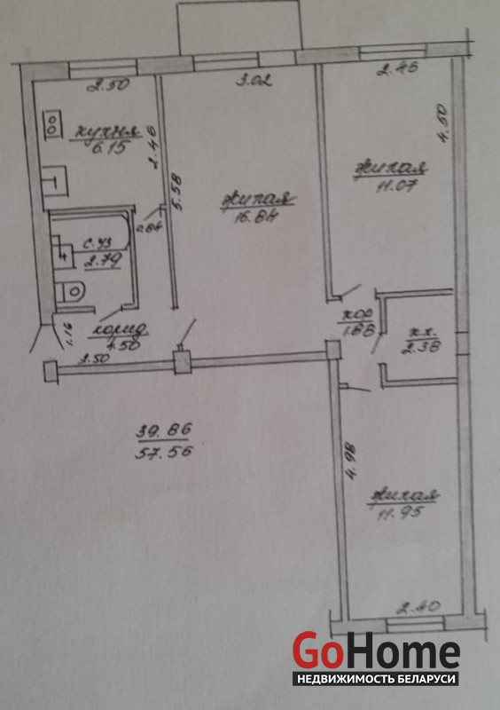 Площадь: общая 57.56 м² / жилая 39.86 м² / кухня 6.15 м².