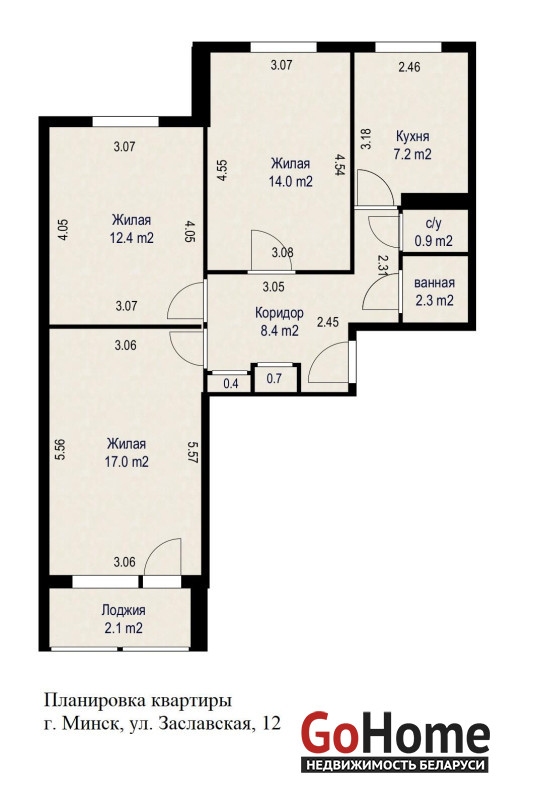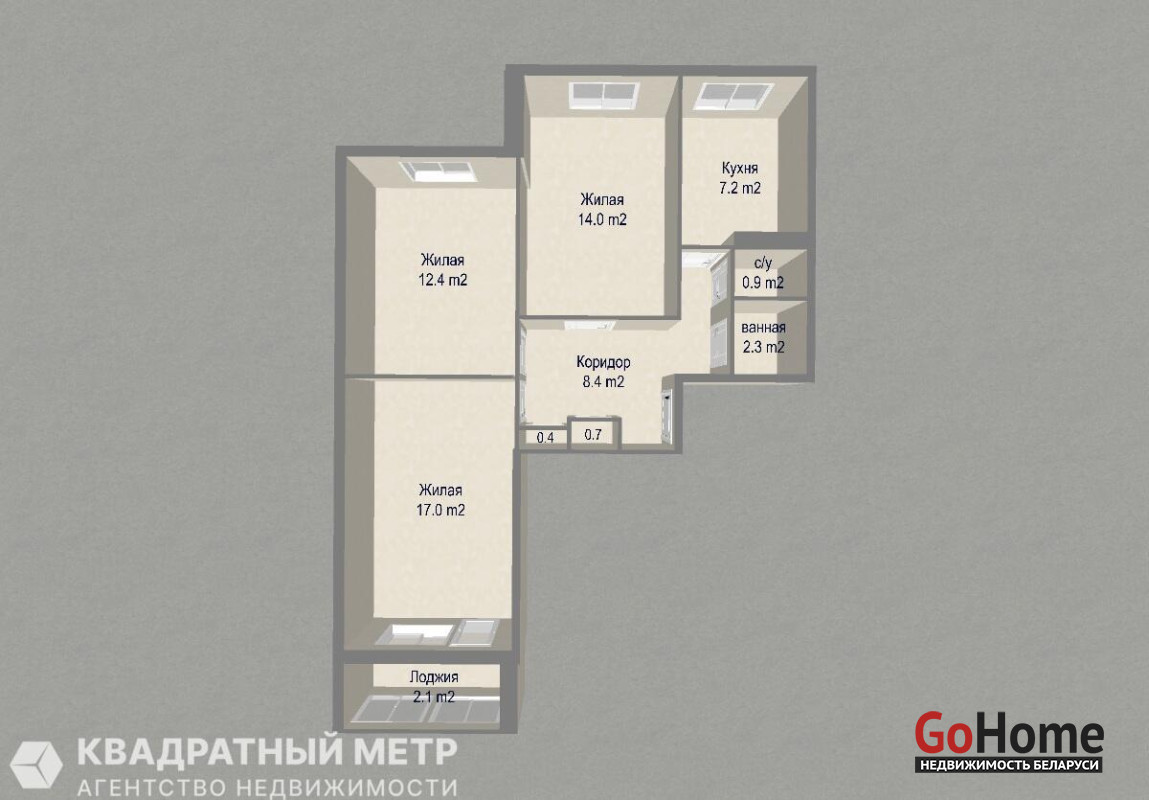 Общая площадь 63,3 кв. м., жилая площадь 43,4 кв. м, кухня 7,2 кв. м. высота потолков 2.57 м.