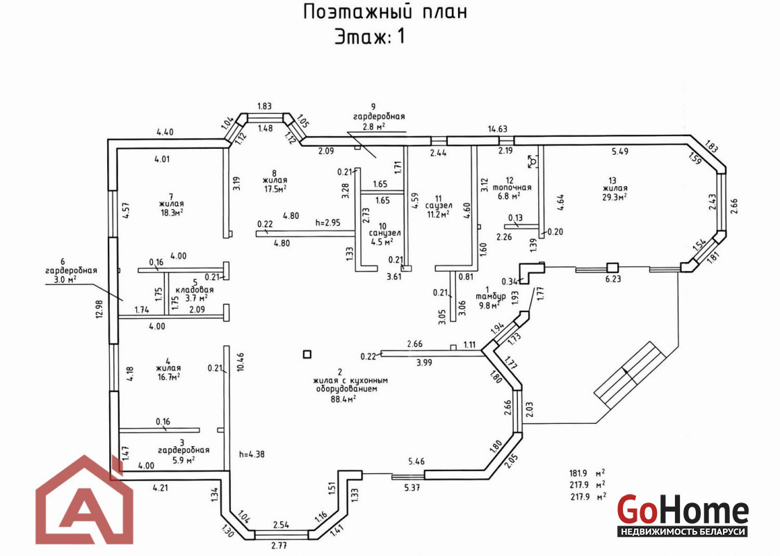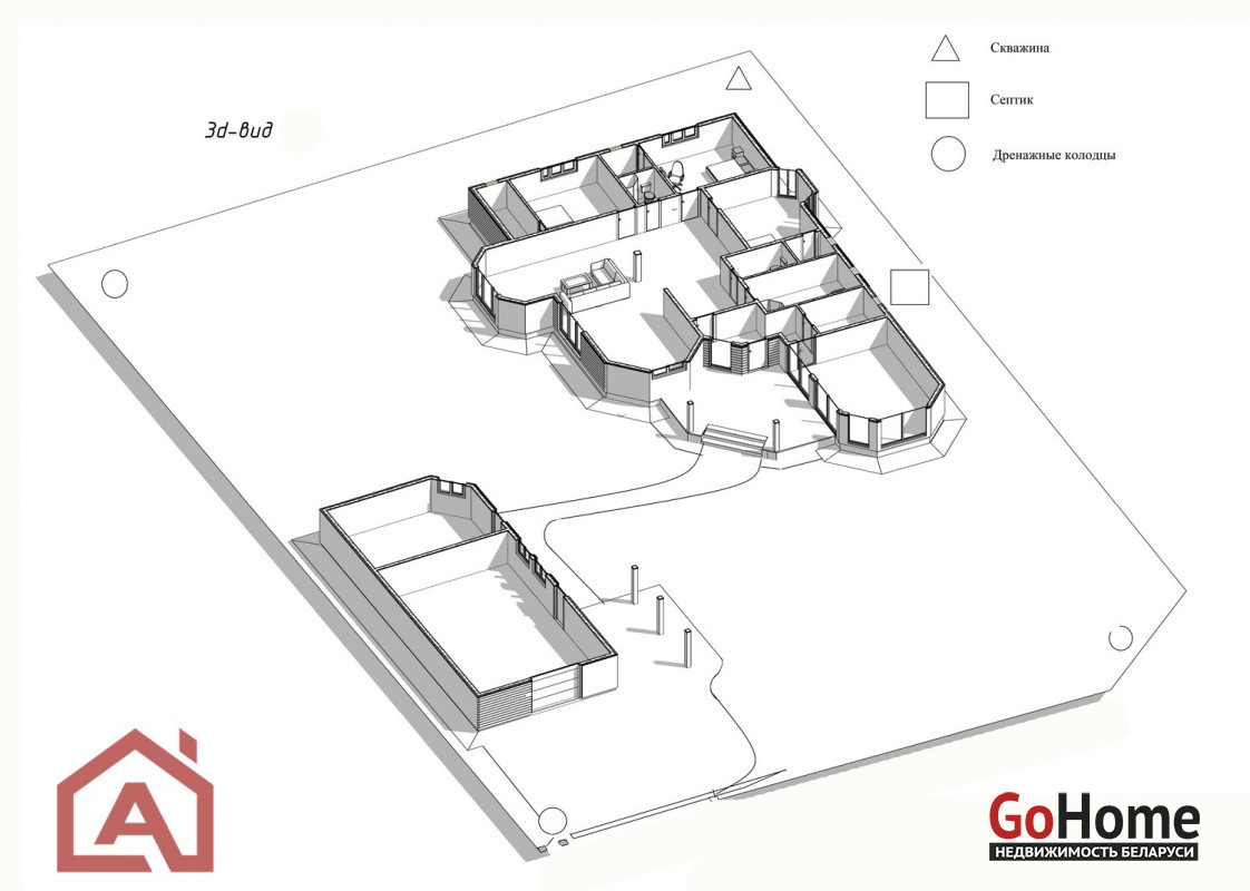 1 этаж: Просторная гостиная-столовая с панорамными окнами и выходом на террасу, зона кухни, 3 спальни, каминная, 2 с/у, котельная.