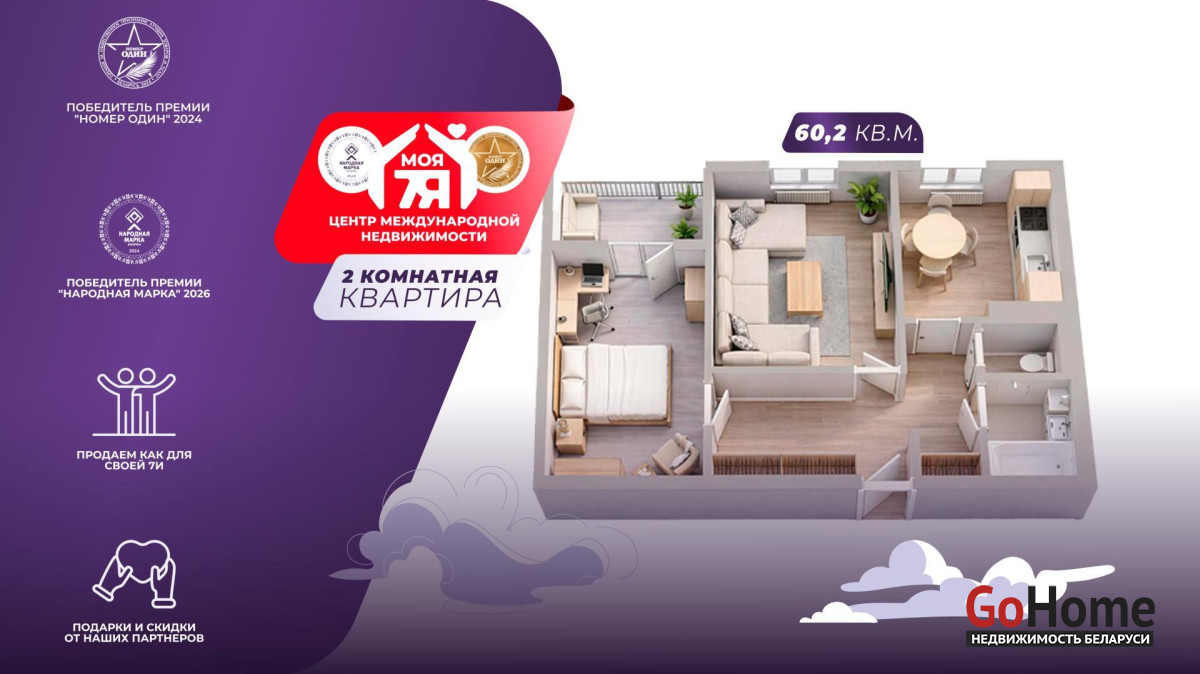 -Предлагается квартира на комфортном 2 этаже 5-этажного дома в новом жилом комплексе, общей площадью 60,2 кв.м., жилая — 32,37 кв.м.