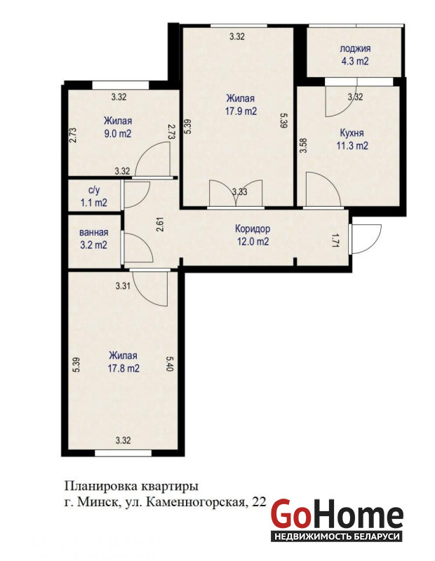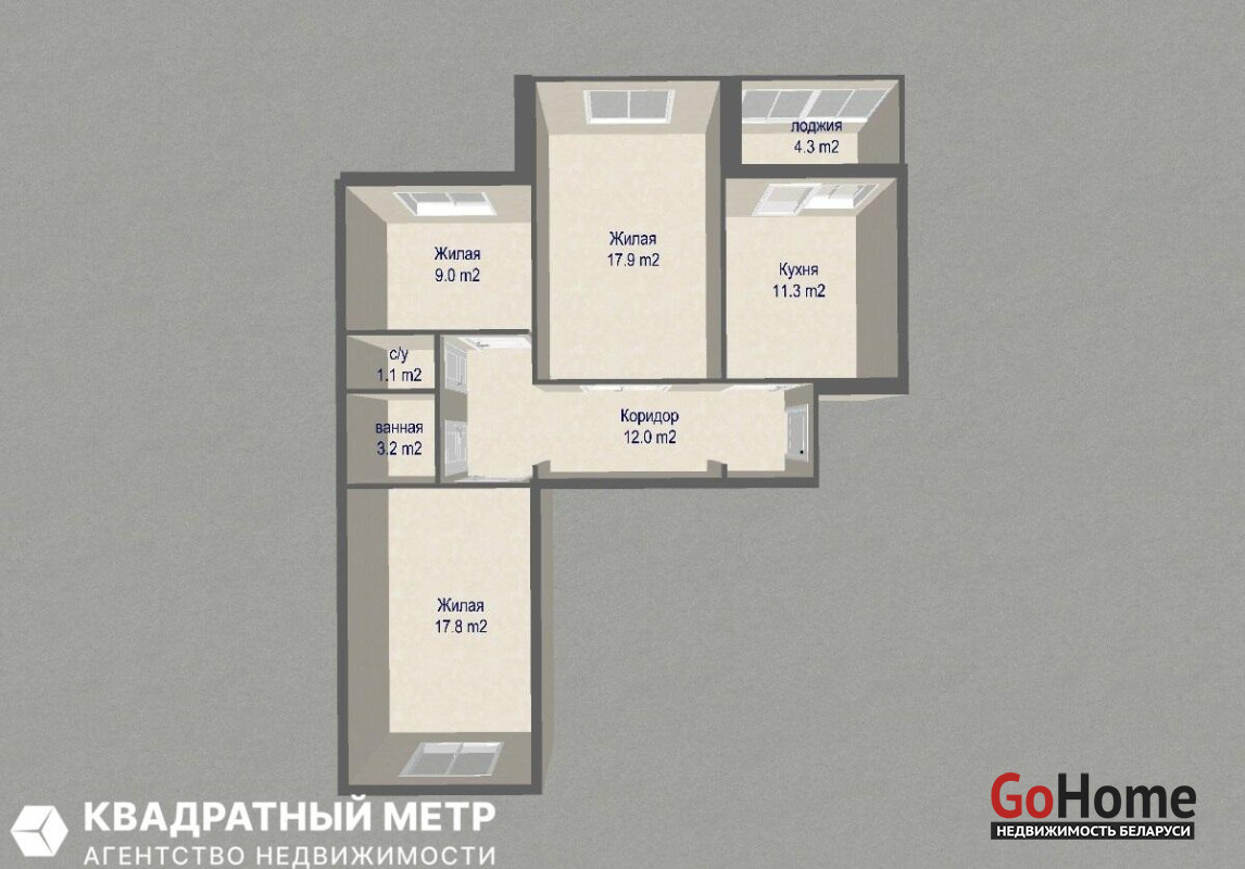 Общая площадь — 75,3 м2 по СНБ. Планировка продумана до мелочей: все комнаты изолированы и правильной формы.
