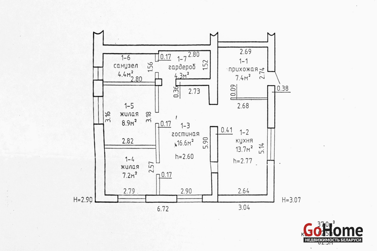 Площадь: Общая – 63 м; Жилая – 37 м; Кухня – 13.7 м; Гардеробная – 4.3 м; Санузел – 4,4 м; Прихожая – 7.4 м;