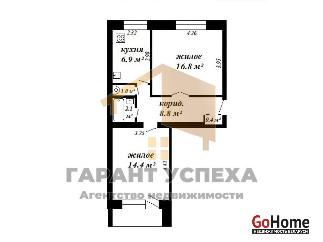 Площадь - 50,4 м²(по СНБ 52,1 м²), кухня - 6,9 м².