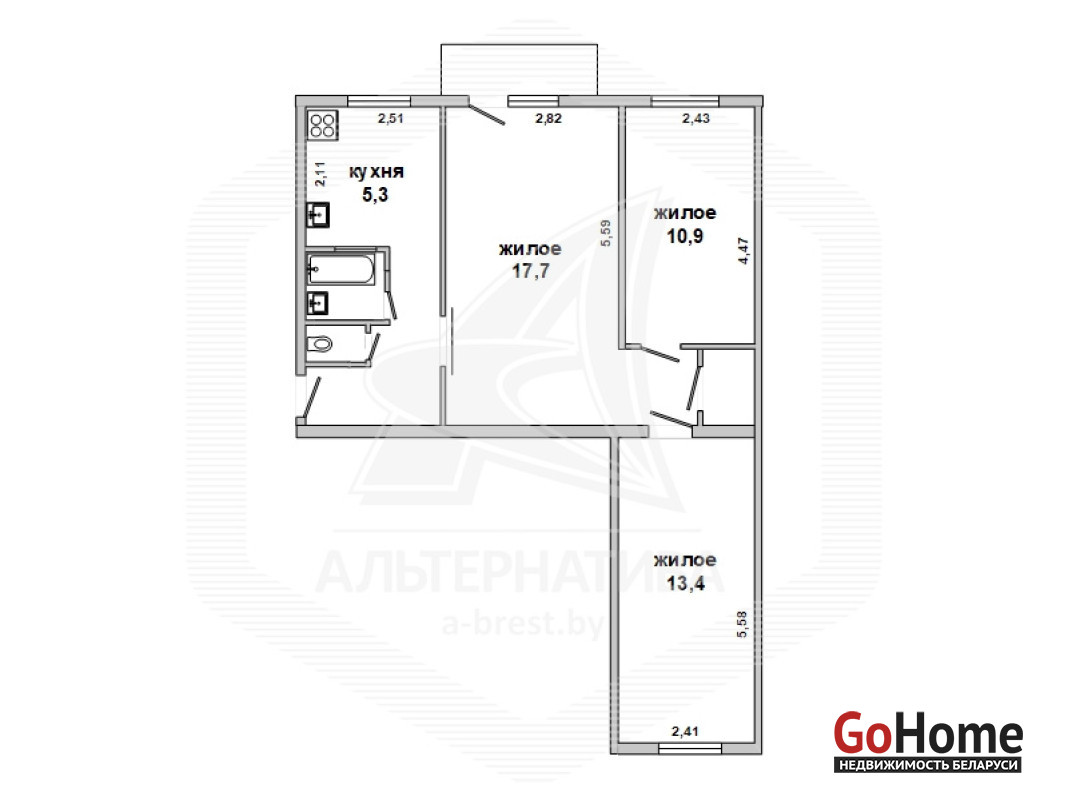 3-комнатная квартира, г. Брест, ул. Гоголя, 1966 г.п., 3 / 5 кирпич, 57,0 / 56,2 / 42,0 / 5,3, санузел раздельный, балкон застеклен, подвал, стеклопакеты, межкомнатные двери - МДФ, входная дверь металлическая, потолки (2,46 м) - натяжные (в комнатах), из гипсокартона (в коридоре) и снежка (в кухне), полы - ламинат и плитка, стены оклеены обоями, в санузле современная плитка, акриловая ванна, заменен полотенцесушитель, заменены сантехнические трубы, газовая колонка в кухне, телефон, домофон. Кухонный гарнитур, варочная поверхность, духовой шкаф, вытяжка, два шкафа-купе (в спальне, в прихожей), комод, тумба, навесная полка, все светильники, рольшторы, мебель в прихожей, комод (в спальне). Квартира с хорошим ремонтом. Чистый подъезд. Лот - 260495