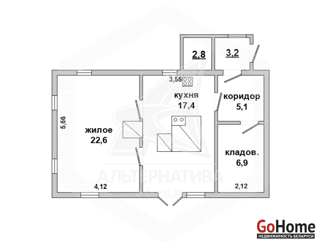 Жилой дом в Кобринском р-не. 1964 г.п., 2025 г. реконструция. 1 этаж. Общ.СНБ - 58,0 кв.м, общ.- 52,0 кв.м, жил.- 22,6 кв.м, кух.- 17,4 кв.м. 1 комната.