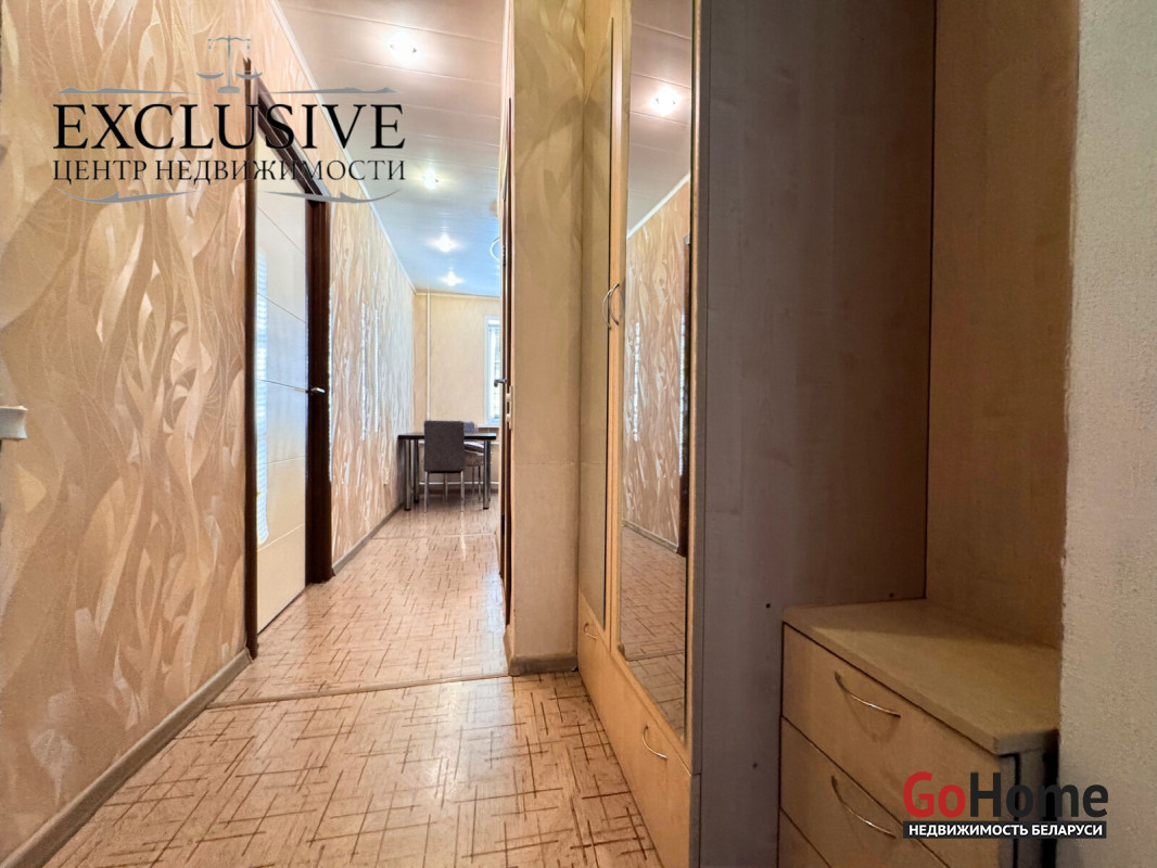 В прихожей вместительный встроенный шкаф с зеркалами, антресолями и выдвижной шуфлядкой.