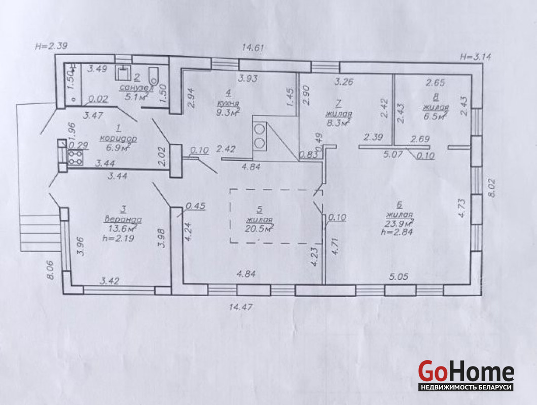 Дом кирпичный, площадью 68,5 м2., жилая 59,2 м2., кухня 9,3 м2. В доме четыре жилых комнаты, проходной зал, кухня, прихожая и веранда. Санузел в доме. Отопление паровое и печное (по улице вблизи дома проходит газ), вода на улице. Дом требует ремонта.