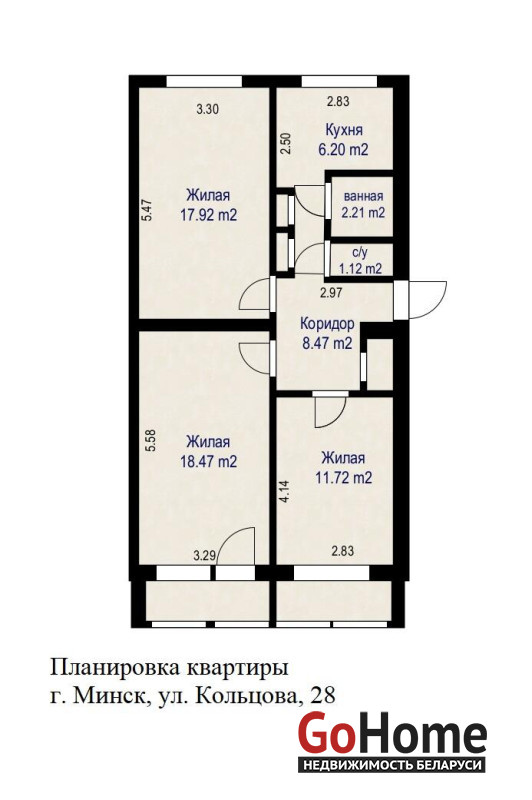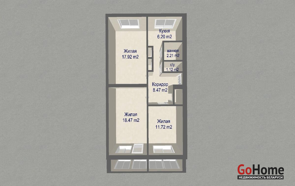 - 3 изолированные комнаты: 18,47 / 17,92 / 11,72 м2