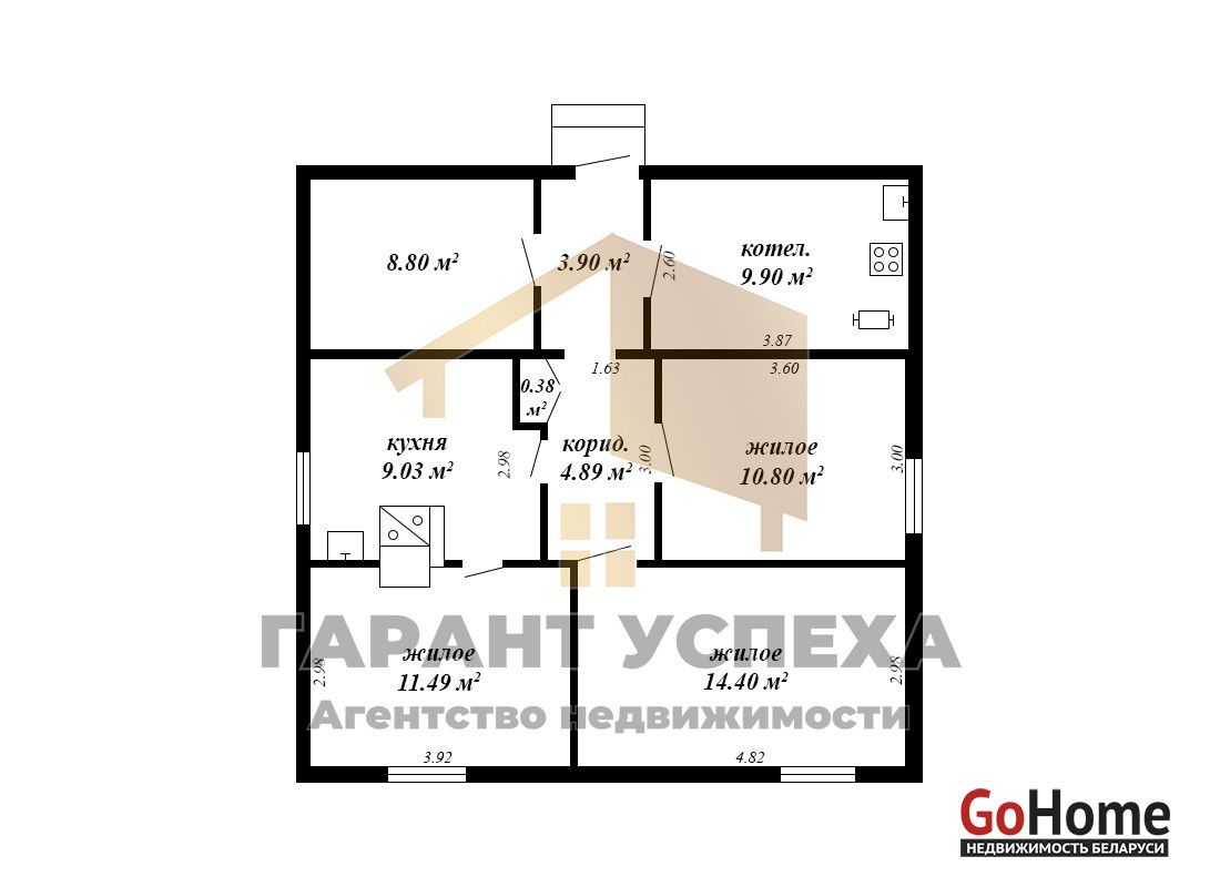 Общая площадь – 73,5/60,9 кв. м, жилая – 36,7 кв. м, кухня – 9 кв. м. Три изолированные жилые комнаты 11,5/14,4/10,8 кв. м. с высотой потолка 2,8 м.