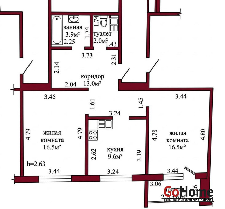 Общая площадь квартиры по СНБ – 64,2 кв.м., общая площадь – 61,5 кв.м., жилая площадь – 33,0 кв.м., кухня – 9,6 кв.м.