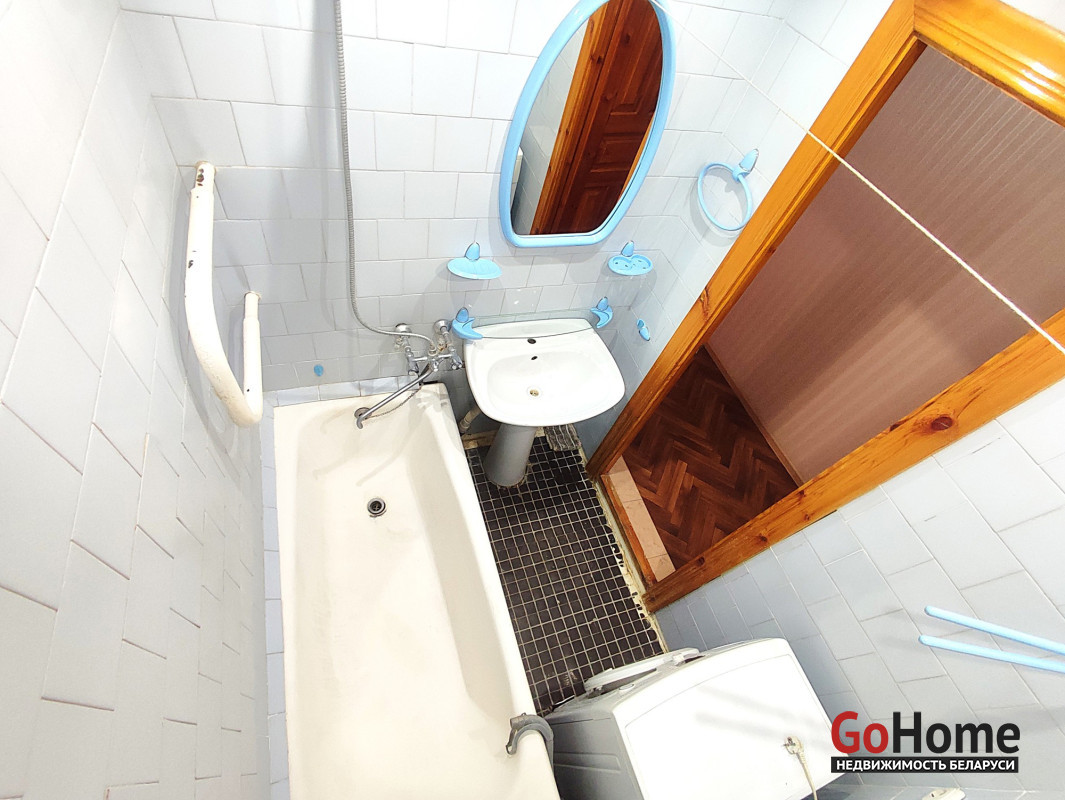 - пол доска массив покрыт ДВП, в санузле и ванной плитка,