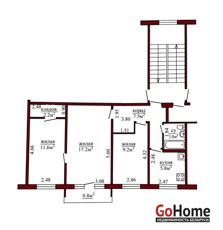 Общая площадь 56,3 кв. м., жилая - 40,2 кв. м., площадь кухни 5,8 кв. м. Высота потолка- 2.50 м. Комнаты 17,2 кв.м , 11,6 кв. м, 9,2 кв.м. Совмещенный санузел. Газовая колонка. Установлены счетчики на воду и газ. Окна и дверь деревянные, балкон застеклен деревянной рамой, пол дощатый. Имеется подвал. Зеленый ухоженный двор.