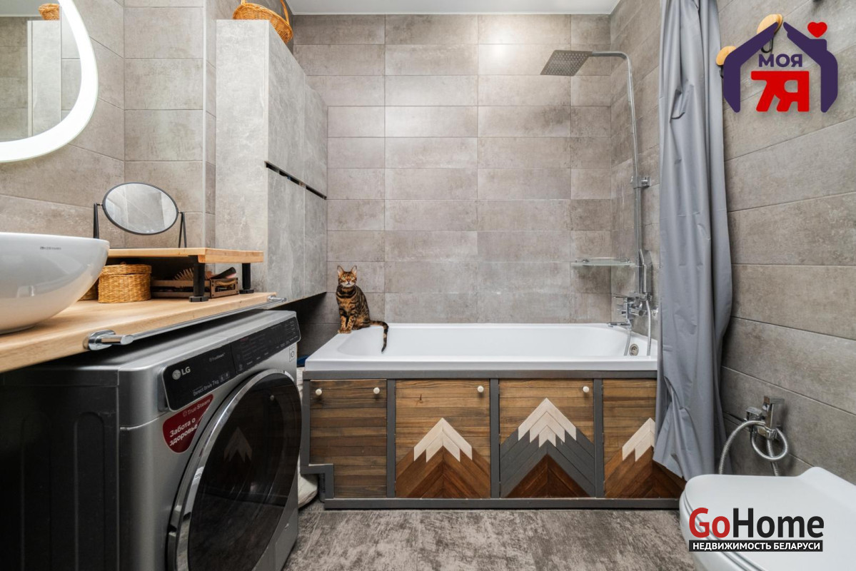 - Ванная комната отделана керамогранитом на полах и стенах, потолок натяжной. Установлена акриловая ванна, что обеспечивает комфортные водные процедуры. Все помещение выполнено на высоком уровне отделки.