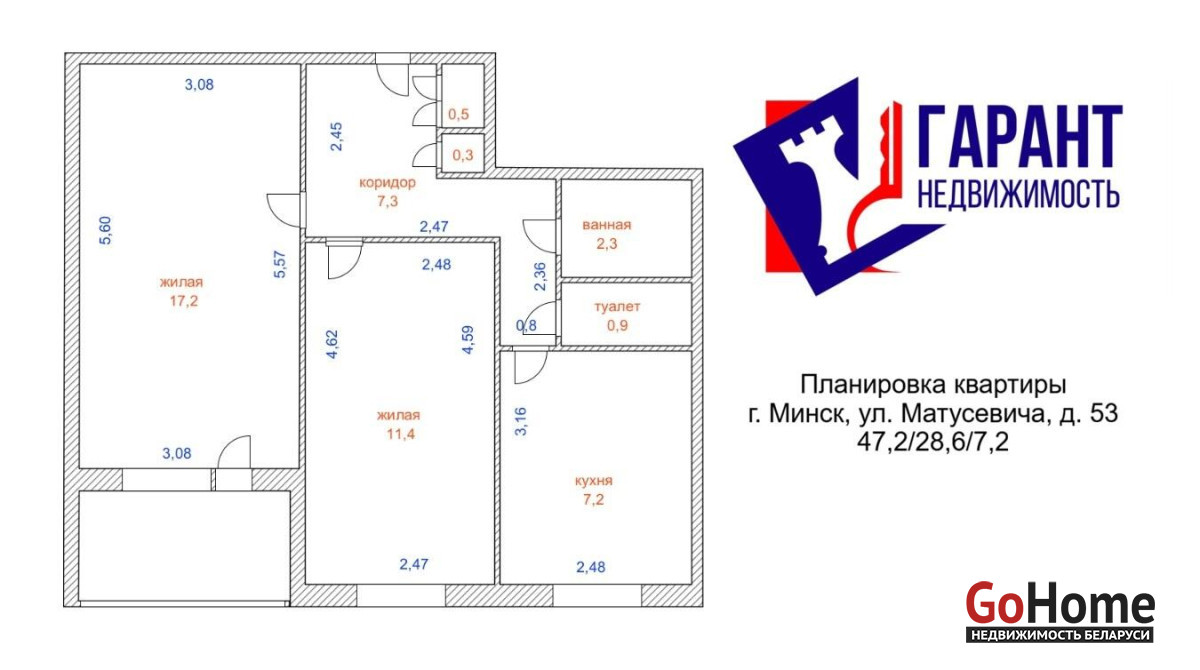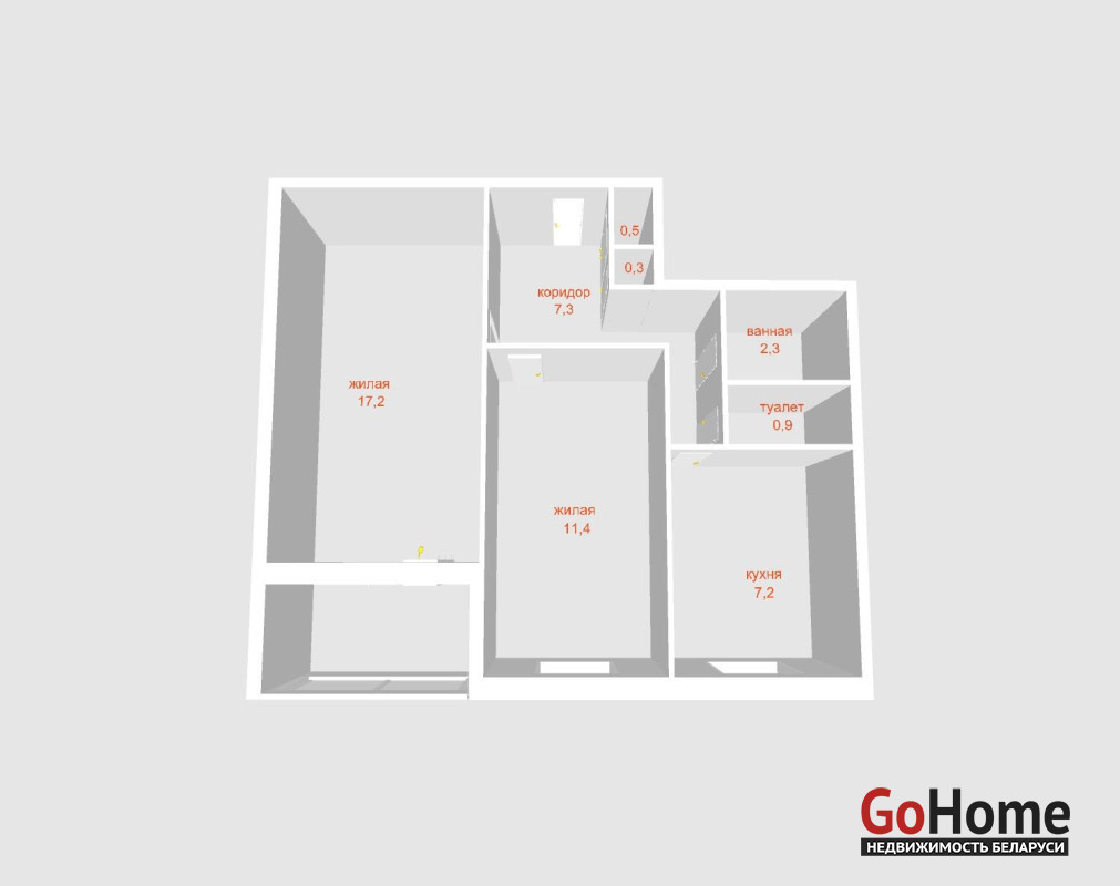 Продуманная грамотная планировка. Жилые комнаты правильной формы 17,2 м2 и 11.4 м2 , коридор 7,3 м2, светлая кухня 7,2 м2, раздельный санузел;