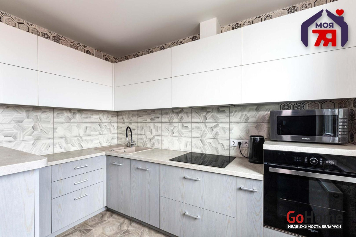 -Современная угловая кухня в светло-серых тонах с белым верхом — мечта любой хозяйки! Стильный фартук из плитки с мраморным рисунком, встроенная техника премиум-класса: варочная панель Bosch, духовой шкаф Whirlpool, СВЧ, холодильник side-by-side. Вместительные шкафы и удобная барная стойка. Кухня не только функциональная, но и невероятно красивая!