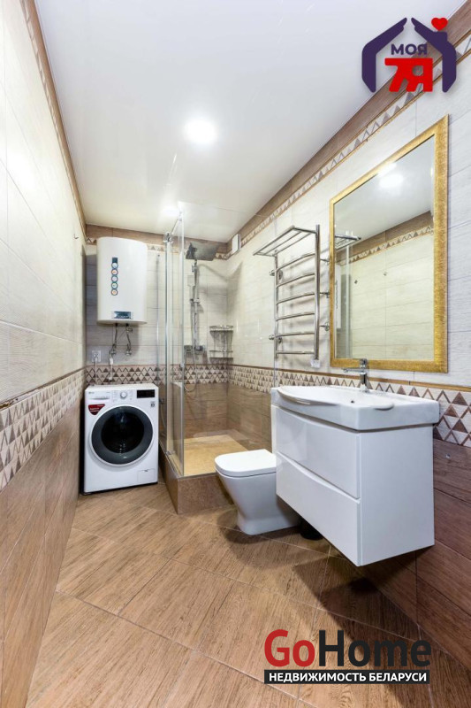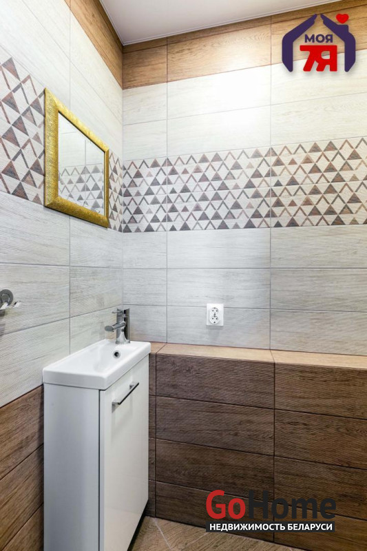 -Два санузла отделаны современной плиткой европейских производителей под дерево с геометрическими акцентами. Установлена качественная сантехника ROCA, в одном из санузлов — стильная душевая кабина из закалённого стекла. Зеркало в стильной раме, продуманные места для хранения. Дизайн выполнен со вкусом — сочетание натуральных оттенков и современных решений.