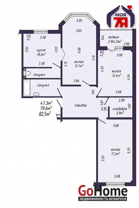 -Квартира расположена на комфортном 4 этаже 10-этажного дома. Общая площадь по СНБ — 82,5 м2, жилая — 47,4 м2.